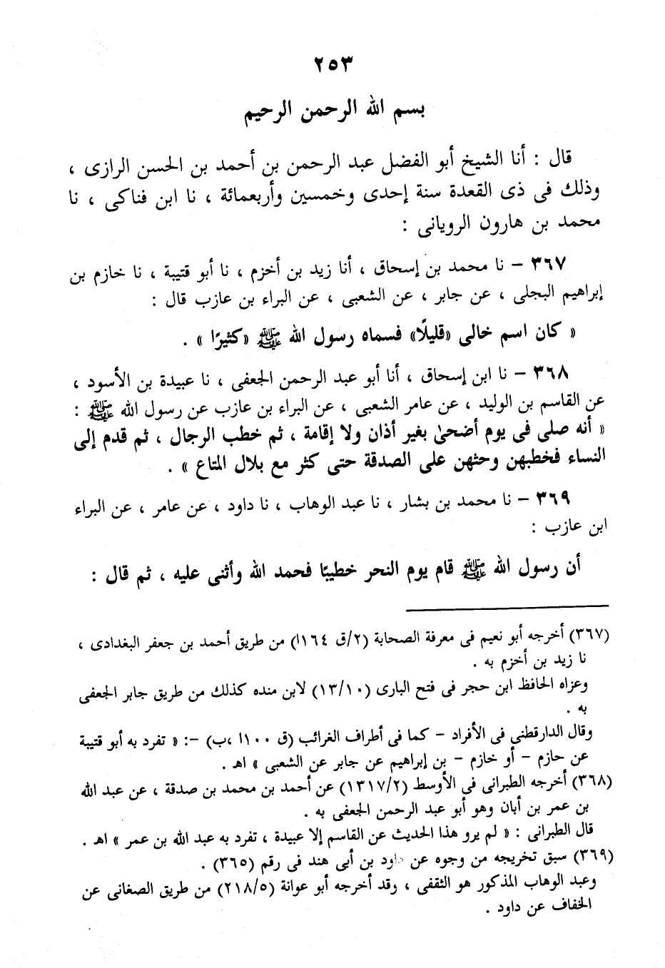قَالَ: أَنَا الشَّيْخُ أَبُو الْفَضْلِ عَبْدُ الرَّحْمَنِ بْنُ أَحْمَدَ بْنِ الْحَسَنِ الرَّازِيُّ وَذَلِكَ فِي ذِي الْقَعْدَةِ سَنَةَ إِحْدَى وَخَمْسِينَ وَأَرْبَعِمِائِةٍ نَا ابْنُ فَنَاكِي، نَا مُحَمَّدُ بْنُ هَارُونَ الرُّويَانِيُّ،