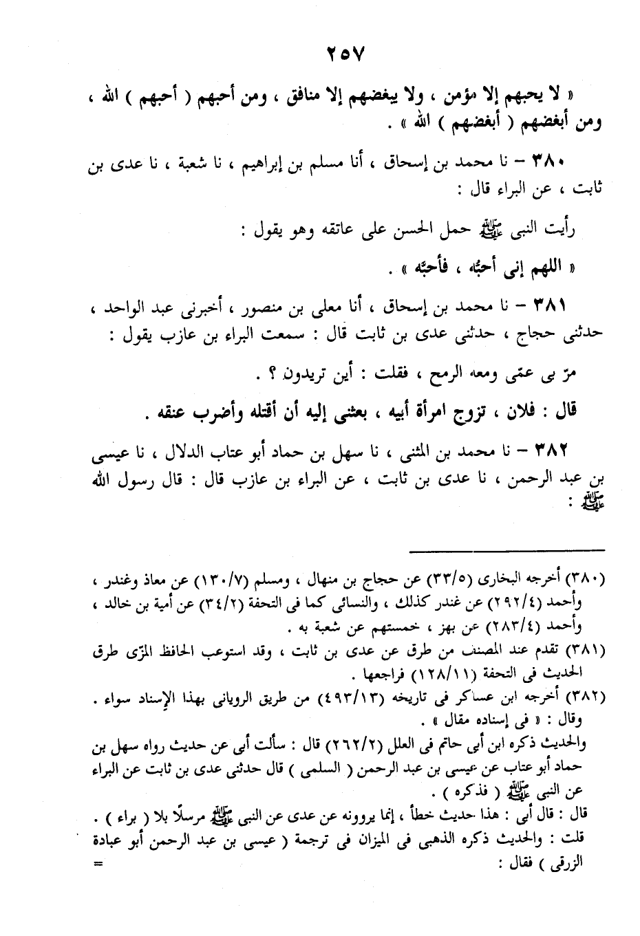 380 - نا مُحَمَّدُ بْنُ إِسْحَاقَ، أنا مُسْلِمُ بْنُ إِبْرَاهِيمَ، نا شُعْبَةُ، نا عَدِيُّ بْنُ ثَابِتٍ، عَنِ الْبَرَاءِ قَالَ: رَأَيْتُ النَّبِيَّ صَلَّى اللهُ عَلَيْهِ وَسَلَّمَ حَمَلَ الْحَسَنَ عَلَى عَاتِقِهِ وَهُوَ يَقُولُ: «§اللَّهُمَّ إِنِّي أُحِبُّهُ فَأَحِبَّهُ»