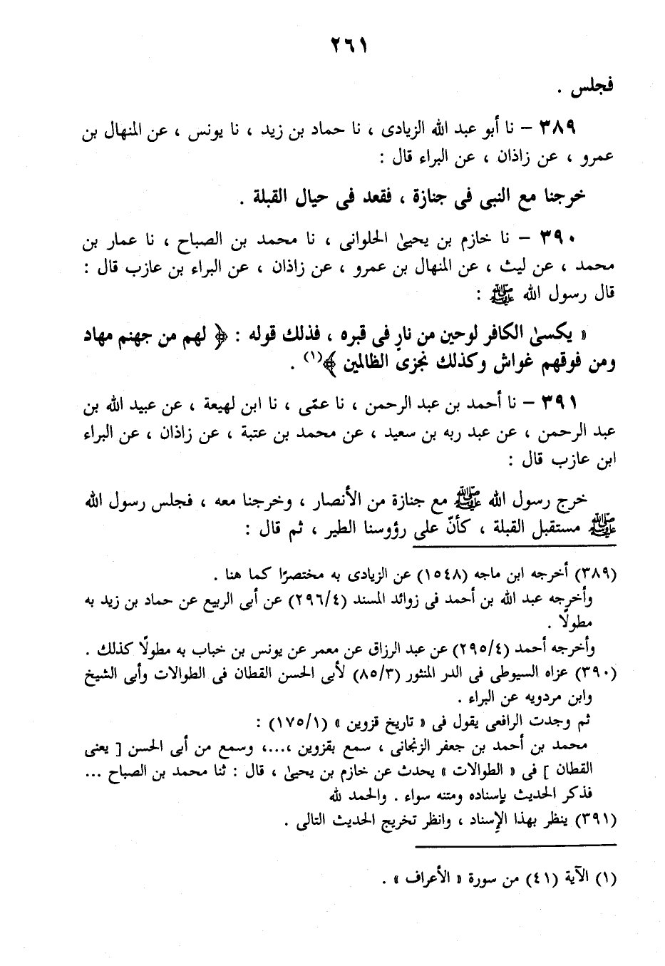 390 - نا حَازِمُ بْنُ يَحْيَى الْحُلْوَانِيُّ، نا مُحَمَّدُ بْنُ الصَّبَّاحِ، نا عَمَّارُ بْنُ مُحَمَّدٍ، عَنْ لَيْثٍ، عَنِ الْمِنْهَالِ بْنِ عَمْرٍو، عَنْ زَاذَانَ، عَنِ الْبَرَاءِ بْنِ عَازِبٍ قَالَ: قَالَ رَسُولُ اللَّهِ صَلَّى اللهُ عَلَيْهِ وَسَلَّمَ: " §يُكْسَى الْكَافِرُ لَوْحَيْنِ مِنْ نَارٍ فِي قَبْرِهِ، فَذَلِكَ قَوْلُهُ: {لَهُمْ مِنْ جَهَنَّمَ مِهَادٌ وَمِنْ فَوْقِهِمْ غَوَاشٍ وَكَذَلِكَ نَجْزِي الظَّالِمِينَ} [الأعراف: 41] "