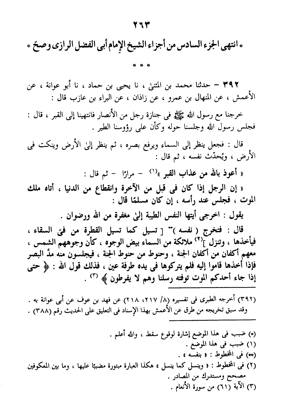 392 - حَدَّثَنَا مُحَمَّدُ بْنُ الْمُثَنَّى، نا مُحَمَّدُ بْنُ الْمُثَنَّى، نا يَحْيَى بْنُ حَمَّادٍ، نا أَبُو عَوَانَةَ، عَنِ الْأَعْمَشِ، عَنِ الْمِنْهَالِ بْنِ عَمْرٍو، عَنْ زَاذَانَ، عَنِ الْبَرَاءِ بْنِ عَازِبٍ قَالَ: خَرَجْنَا مَعَ رَسُولِ اللَّهِ صَلَّى اللهُ عَلَيْهِ وَسَلَّمَ فِي جِنَازَةِ رَجُلٍ مِنَ الْأَنْصَارِ، فَانْتَهَيْنَا إِلَى الْقَبْرِ، قَالَ: فَجَلَسَ رَسُولُ اللَّهِ صَلَّى اللهُ عَلَيْهِ وَسَلَّمَ وَجَلَسْنَا حَوْلَهُ وَكَأَنَّ عَلَى رُءُوسِنَا الطَّيْرَ، قَالَ: فَجَعَلَ يَنْظُرُ إِلَى السَّمَاءِ وَيَرْفَعُ بَصَرَهُ ثُمَّ يَنْظُرُ إِلَى الْأَرْضِ وَيَنْكُتُ فِي الْأَرْضِ وَيُحَدِّثُ نَفْسَهُ، ثُمَّ قَالَ: «§أَعُوذُ بِاللَّهِ مِنْ عَذَابِ الْقَبْرِ» مِرَارًا، ثُمَّ قَالَ: " إنَّ الرَّجُلَ إِذَا كَانَ فِي قَبَلٍ مِنَ الْآخِرَةِ وَانْقِطَاعٍ مِنَ الدُّنْيَا أَتَاهُ مَلَكُ الْمَوْتِ فَجَلَسَ عِنْدَ رَأْسِهِ إنْ كَانَ مُسْلِمًا قَالَ يَقُولُ: اخْرُجِي أَيَّتُهَا النَّفْسُ الطَّيِّبَةُ إِلَى مَغْفِرَةٍ مِنَ اللَّهِ وَرِضْوَانٍ، قَالَ: فَتَخْرُجُ نَفْسُهُ تَسِيلُ كَمَا تَسِيلُ الْقَطْرَةُ مِنْ فِي السِّقَاءِ، فَيَأْخُذُهَا وَتَنْزِلُ مَلَائِكَةٌ مِنَ السَّمَاءِ بِيضُ الْوُجُوهِ كَأنَّ وُجُوهَهُمُ الشَّمْسُ، مَعَهُمْ أَكْفَانٌ مِنْ أَكْفَانِ الْجَنَّةِ وَحَنُوطٌ مِنْ حَنُوطِ الْجَنَّةِ، فَيَجْلِسُونَ مِنْهُ مَدَّ الْبَصَرِ، فَإِذَا أَخَذَهَا قَامُوا إِلَيْهِ فَلَمْ يَتْرُكُوهَا فِي يَدِهِ طَرْفَةَ عَيْنٍ، فَذَلِكَ قَوْلُ اللَّهِ: {حَتَّى إِذَا جَاءَ أَحَدَكُمُ الْمَوْتُ تَوَفَّتْهُ رُسُلُنَا وَهُمْ لَا يُفَرِّطُونَ} [الأنعام: 61]