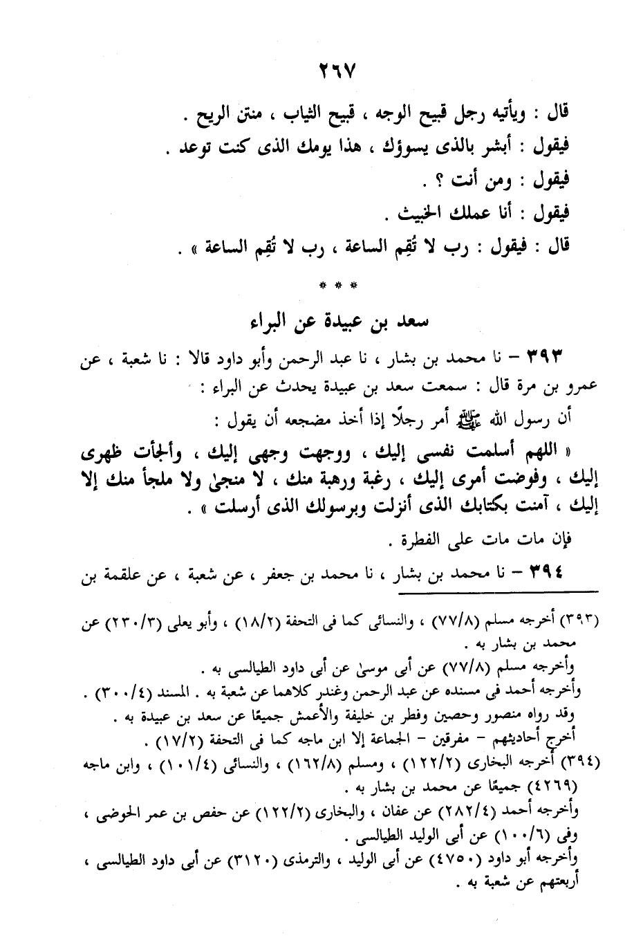 393 - نا مُحَمَّدُ بْنُ بَشَّارٍ، نا عَبْدُ الرَّحْمَنِ، وَأَبُو دَاوُدَ قَالَا: حَدَّثَنَا شُعْبَةُ، عَنْ عَمْرِو بْنِ مُرَّةَ قَالَ: سَمِعْتُ سَعْدَ بْنَ عُبَيْدَةَ يُحَدِّثُ، عَنِ الْبَرَاءِ أَنَّ رَسُولَ اللَّهِ صَلَّى اللهُ عَلَيْهِ وَسَلَّمَ أَمَرَ رَجُلًا إِذَا أَخَذَ مَضْجَعَهُ أَنْ يَقُولَ: «§اللَّهُمَّ أَسْلَمْتُ نَفْسِي إِلَيْكَ، وَوَجَّهْتُ وَجْهِي إِلَيْكَ، وَأَلْجَأْتُ ظَهْرِي إِلَيْكَ، وَفَوَّضْتُ أَمْرِي إِلَيْكَ، رَغْبَةً وَرَهْبَةً مِنْكَ، لَا مَنْجَى وَلَا مَلْجَأَ مِنْكَ إِلَّا إِلَيْكَ، آمَنْتُ بِكِتَابِكَ الَّذِي أَنْزَلْتَ، وَبِرَسُولِكَ الَّذِي أَرْسَلْتَ» فَإِنْ مَاتَ، مَاتَ عَلَى الْفِطْرَةِ "