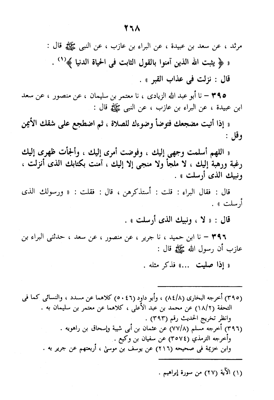 395 - نا أَبُو عَبْدِ اللَّهِ الزِّيَادِيُّ، نا مُعْتَمِرُ بْنُ سُلَيْمَانَ، عَنْ مَنْصُورٍ، عَنْ سَعْدِ بْنِ عُبَيْدَةَ، عَنِ الْبَرَاءِ بْنِ عَازِبٍ، عَنِ النَّبِيِّ صَلَّى اللهُ عَلَيْهِ وَسَلَّمَ قَالَ: " §إِذَا أَتَيْتَ مَضْجَعَكَ فَتَوَضَّأْ وُضُوءَكَ لِلصَّلَاةِ، ثُمَّ اضْطَجِعْ عَلَى شِقِّكَ الْأَيْمَنِ، وَقُلِ: اللَّهُمَّ أَسْلَمْتُ وَجْهِي إِلَيْكَ، وَفَوَّضْتُ أَمْرِي إِلَيْكَ، وَأَلْجَأْتُ ظَهْرِي إِلَيْكَ، رَغْبَةً وَرَهْبَةً إِلَيْكَ، لَا مَلْجَأَ ولا مَنْجَى إِلَّا إِلَيْكَ، آمَنْتُ بِكِتَابِكَ الَّذِي أَنْزَلْتَ وَنَبِيِّكَ الَّذِي أَرْسَلْتَ " قَالَ: فَقَالَ الْبَرَاءُ: قُلْتُ: أَسْتَذْكِرُهُنَّ، قَالَ: فَقُلْتُ: وَرَسُولِكَ الَّذِي أَرْسَلْتَ، قَالَ: «لَا وَنَبِيِّكَ الَّذِي أَرْسَلْتَ»