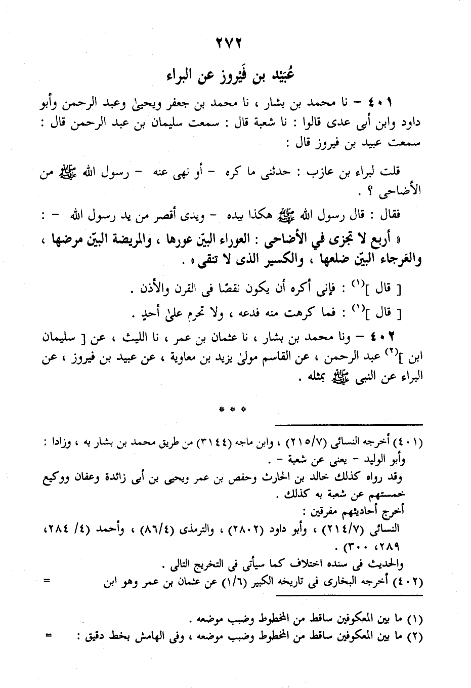 401 - نا مُحَمَّدُ بْنُ بَشَّارٍ، نا مُحَمَّدُ بْنُ جَعْفَرٍ، وَيَحْيَى، وَعَبْدُ الرَّحْمَنِ، وَأَبُو دَاوُدَ، وَابْنُ أَبِي عَدِيٍّ قَالُوا: نا شُعْبَةُ قَالَ: سَمِعْتُ سُلَيْمَانَ بْنَ عَبْدِ الرَّحْمَنِ قَالَ: سَمِعْتُ عُبَيْدَ بْنَ فَيْرُوزَ قَالَ: قُلْتُ لِبَرَاءِ بْنِ عَازِبٍ: حَدَّثَنِي مَا كَرِهَ أَوْ نَهَى عَنْهُ رَسُولُ اللَّهِ صَلَّى اللهُ عَلَيْهِ وَسَلَّمَ مِنَ الْأَضَاحِي فَقَالَ: قَالَ رَسُولُ اللَّهِ صَلَّى اللهُ عَلَيْهِ وَسَلَّمَ هَكَذَا بِيَدِهِ - وَيَدِي أَقْصَرُ مِنْ يَدِ رَسُولِ اللَّهِ -: " §أَرْبَعٌ لَا تُجْزِي فِي الْأَضَاحِي: الْعَوْرَاءُ الْبَيِّنُ عَوَرُهَا، وَالْمَرِيضَةُ الْبَيِّنُ مَرَضُهَا، وَالْعَرْجَاءُ الْبَيِّنُ ضِلَعُهَا، وَالْكَسِيرُ الَّذِي لَا تَنْقَى " قَالَ: فَإِنِّي أَكْرَهُ أَنْ يَكُونَ نَقْصًا فِي الْقَرْنِ وَالْأُذُنِ، قَالَ: فَمَا كَرِهْتَ مِنْهُ فَدَعْهُ وَلَا تُحَرِّمْ عَلَى أَحَدٍ "