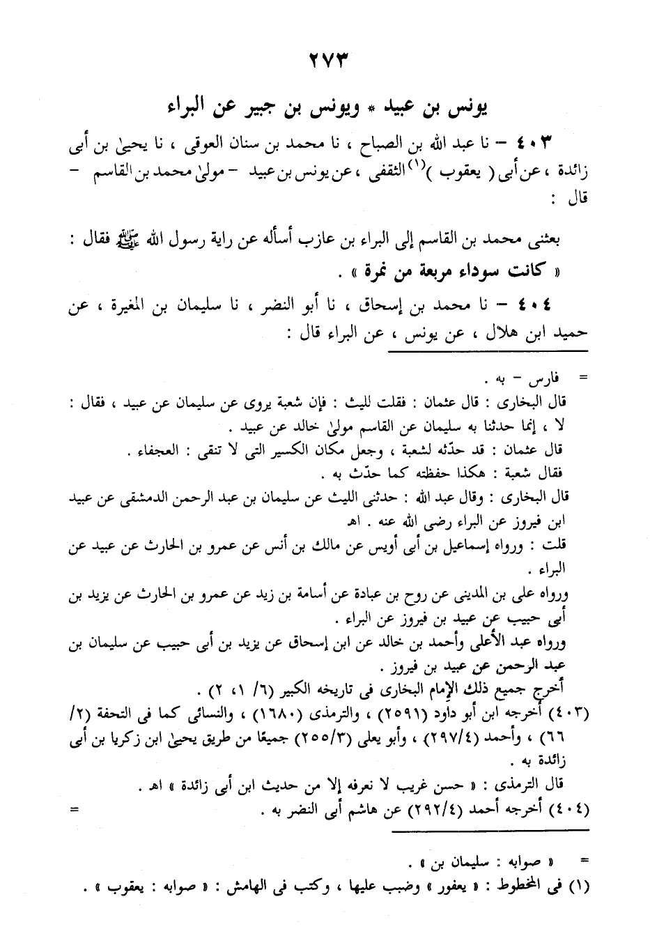 403 - نا عَبْدُ اللَّهِ بْنُ الصَّبَّاحِ، نا مُحَمَّدُ بْنُ سِنَانٍ الْعَوْقِيُّ، نا يَحْيَى بْنُ أَبِي زَائِدَةَ، عَنْ أَبِي يَعْقُوبَ الثَّقَفِيِّ، عَنْ يُونُسَ بْنِ عُبَيْدٍ مَوْلَى مُحَمَّدِ بْنِ الْقَاسِمِ قَالَ: بَعَثَنِي مُحَمَّدُ بْنُ الْقَاسِمِ إِلَى الْبَرَاءِ بْنِ عَازِبٍ أَسْأَلُهُ عَنْ §رَايَةِ رَسُولِ اللَّهِ صَلَّى اللهُ عَلَيْهِ وَسَلَّمَ فَقَالَ: كَانَتْ سَوْدَاءَ مُرَبَّعَةً مِنْ نَمِرَةٍ "