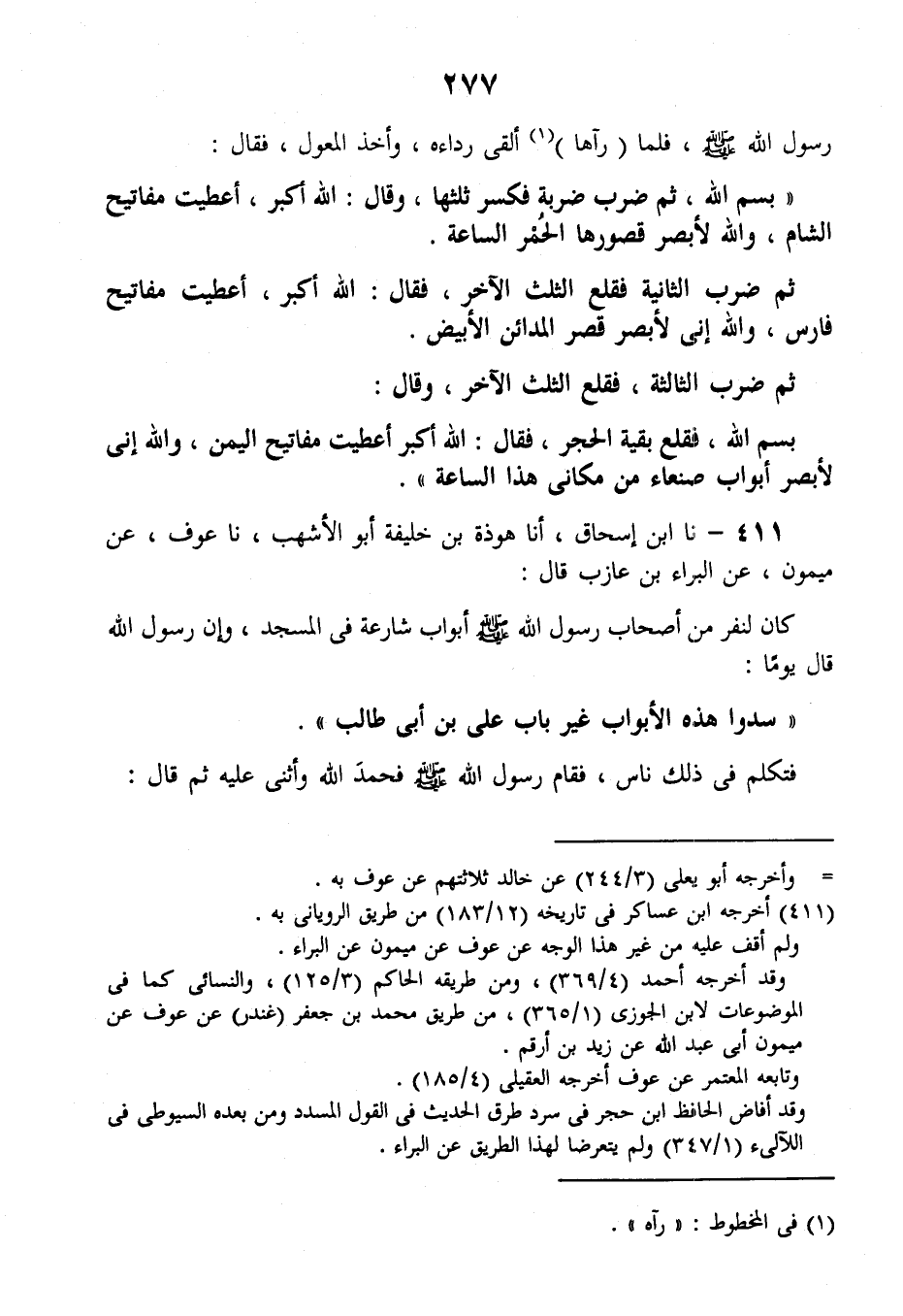 411 - نا ابْنُ إِسْحَاقَ، أنا هَوْذَةُ بْنُ خَلِيفَةَ أَبُو الْأشْهَبِ، نا عَوْفٌ، عَنْ مَيْمُونٍ، عَنِ الْبَرَاءِ بْنِ عَازِبٍ قَالَ: كَانَ لِنَفَرٍ مِنْ أَصْحَابِ رَسُولِ اللَّهِ صَلَّى اللهُ عَلَيْهِ وَسَلَّمَ أَبْوَابٌ شَارِعَةٌ فِي الْمَسْجِدِ، وَإِنَّ رَسُولَ اللَّهِ صَلَّى اللهُ عَلَيْهِ وَسَلَّمَ قَالَ يَوْمًا: «§سُدُّوا هَذِهِ الْأَبْوَابَ غَيْرَ بَابِ عَلِيِّ بْنِ أَبِي طَالِبٍ» فَتَكَلَّمَ فِي ذَلِكَ نَاسٌ، فَقَامَ رَسُولُ اللَّهِ صَلَّى اللهُ عَلَيْهِ وَسَلَّمَ فَحَمِدَ اللَّهَ وَأَثْنَى عَلَيْهِ ثُمَّ قَالَ -[278]-: «إِنِّي أُمِرْتُ بِسَدِّ الْأَبْوَابِ غَيْرِ بَابِ عَلِيِّ بْنِ أَبِي طَالِبٍ، فَقَالَ فِيهِ قَائِلُكُمْ، وَإِنِّي وَاللَّهِ مَا فَتَحْتُ شَيْئًا وَلَا سَدَدْتُهُ، وَلَكِنِّي أُمِرْتُ بِشَىْءٍ فَاتَّبَعْتُهُ»