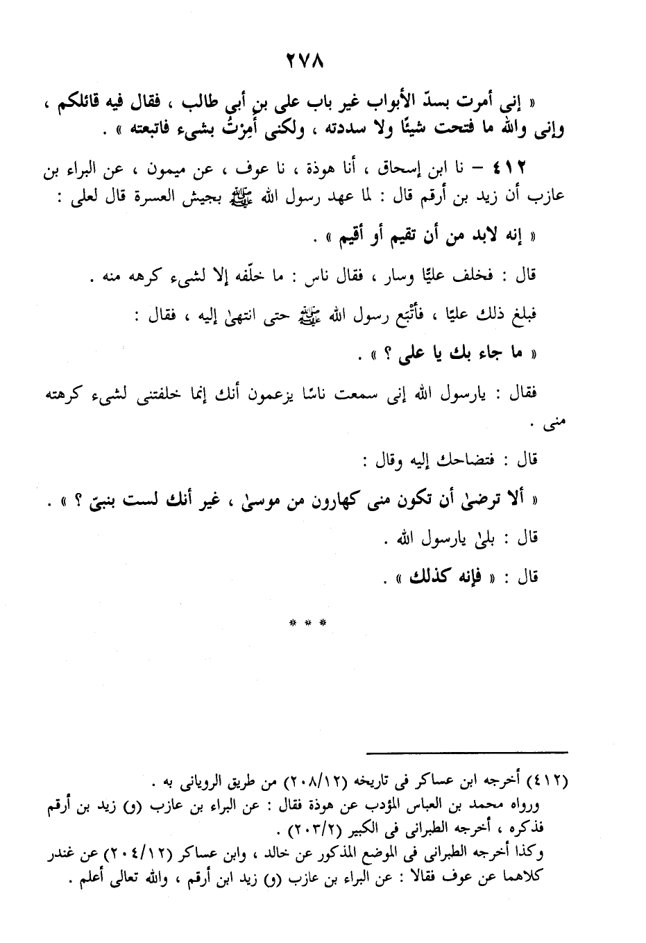 412 - نا ابْنُ إِسْحَاقَ، أنا هَوْذَةُ، نا عَوْفٌ، عَنْ مَيْمُونٍ، عَنِ الْبَرَاءِ بْنِ عَازِبٍ: أَنَّ زَيْدَ بْنَ أَرْقَمَ قَالَ: لَمَّا عَهِدَ رَسُولُ اللَّهِ صَلَّى اللهُ عَلَيْهِ وَسَلَّمَ بِجَيْشِ الْعُسْرَةِ قَالَ لِعَلِيٍّ: «إِنَّهُ لَا بُدَّ مِنْ أَنْ تُقِيمَ أَوْ أُقِيمَ» قَالَ: فَخَلَّفَ عَلِيًّا وَسَارَ، فَقَالَ نَاسٌ مَا خَلَّفَهُ إِلَّا لشَىءٍ كَرِهَهُ مِنْهُ، فَبَلَغَ ذَلِكَ عَلِيًّا فَأَتْبَعَ رَسُولَ اللَّهِ صَلَّى اللهُ عَلَيْهِ وَسَلَّمَ حَتَّى انْتَهَى إِلَيْهِ، فَقَالَ: «مَا جَاءَ بِكَ يَا عَلِيُّ» فَقَالَ: يَا رَسُولَ اللَّهِ إِنِّي سَمِعْتُ نَاسًا يَزْعُمُونَ أَنَّكَ إِنَّمَا خَلَّفْتَنِي لشَىءٍ كَرِهْتَهُ مِنِّي قَالَ: فَتَضَاحَكَ إِلَيْهِ، وَقَالَ: «§أَلَا تَرْضَى أَنْ تَكُونَ مِنِّي كَهَارُونَ مِنْ مُوسَى، غَيْرَ أَنَّكَ لَسْتَ بِنَبِيٍّ» قَالَ: بَلَى يَا رَسُولَ اللَّهِ. قَالَ: فَإِنَّهُ كَذَلِكَ "