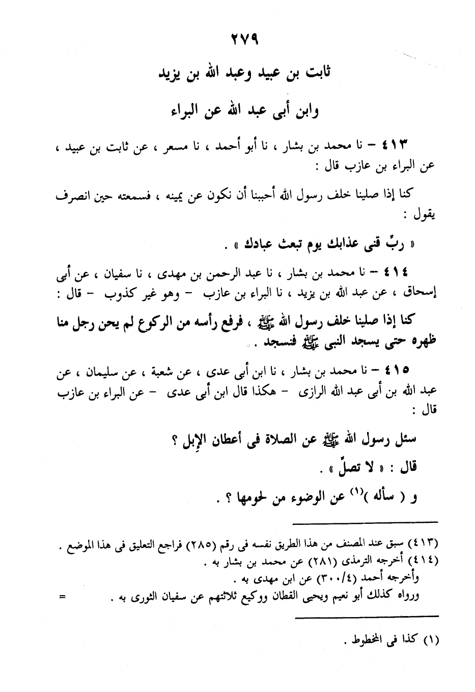 415 - نا مُحَمَّدُ بْنُ بَشَّارٍ، نا ابْنُ أَبِي عَدِيٍّ، عَنْ شُعْبَةَ، عَنْ سُلَيْمَانَ، عَنْ عَبْدِ اللَّهِ بْنِ أَبِي عَبْدِ اللَّهِ الرَّازِيِّ - هَكَذَا قَالَ ابْنُ أَبِي عَدِيٍّ - عَنِ الْبَرَاءِ بْنِ عَازِبٍ قَالَ: سُئِلَ رَسُولُ اللَّهِ صَلَّى اللهُ عَلَيْهِ وَسَلَّمَ عَنِ §الصَّلَاةِ فِي أَعْطَانِ الْأبِلِ قَالَ: «لَا تُصَلِّ» وَسَأَلَهُ عَنِ الْوُضُوءِ مِنْ لُحُومِهَا -[280]- فَقَالَ: «تَوَضَّأْ» وَسُئِلَ عَنِ الصَّلَاةِ فِي مَرَابِضِ الْغَنَمِ فَقَالَ: «صَلِّ» وَسُئِلَ عَنِ الْوُضُوءِ مِنْ لُحُومِهَا فَقَالَ: «لَا تَوَضَّأْ»