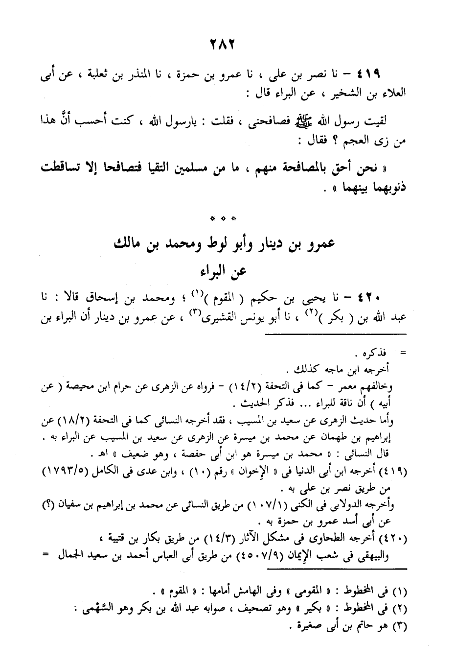 419 - نا نَصْرُ بْنُ عَلِيٍّ، نا عَمْرُو بْنُ حَمْزَةَ، نا الْمُنْذِرُ بْنُ ثَعْلَبَةَ، عَنْ أَبِي الْعَلَاءِ بْنِ الشِّخِّيرِ، عَنِ الْبَرَاءِ قَالَ: لَقِيتُ رَسُولَ اللَّهِ صَلَّى اللهُ عَلَيْهِ وَسَلَّمَ فَصَافَحَنِي فَقُلْتُ: يَا رَسُولَ اللَّهِ كُنْتُ أَحْسِبُ أَنَّ هَذَا مِنْ زِيِّ الْعَجَمِ فَقَالَ: «نَحْنُ أَحَقُّ بِالْمُصَافَحَةِ مِنْهُمْ، §مَا مِنْ مُسْلِمَيْنِ الْتَقَيَا فَتَصَافَحَا إِلَّا تَسَاقَطَتْ ذُنُوبُهُما بَيْنَهُمَا»