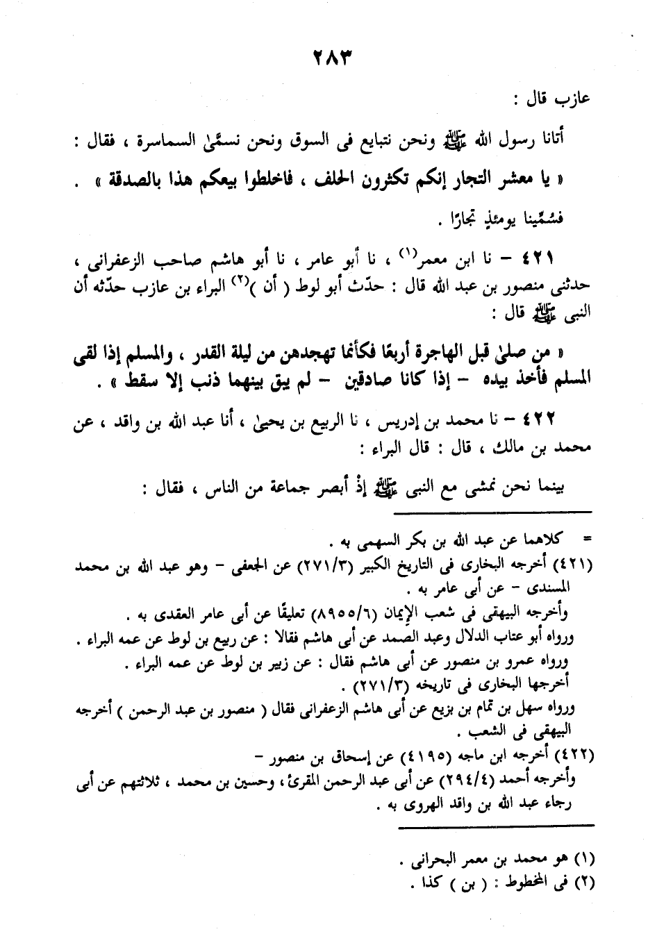 421 - نا ابْنُ مَعْمَرٍ، نا أَبُو عَامِرٍ، نا أَبُو هَاشِمٍ صَاحِبُ الزَّعْفَرَانِيِّ، حَدَّثَنِي مَنْصُورُ بْنُ عَبْدِ اللَّهِ قَالَ: حَدَّثَ أَبُو لُوطٍ، أَنَّ الْبَرَاءَ بْنَ عَازِبٍ حَدَّثَهُ: أَنَّ النَّبِيَّ صَلَّى اللهُ عَلَيْهِ وَسَلَّمَ قَالَ: «§مَنْ صَلَّى قَبْلَ الْهَاجِرَةِ أَرْبَعًا فَكَأَنَّمَا تَهَجَّدَهُنَّ مِنْ لَيْلَةِ الْقَدْرِ، وَالْمُسْلِمُ إِذَا لَقِيَ الْمُسْلِمَ فَأَخَذَ بِيَدِهِ إِذَا كَانَا صَادِقَيْنِ لَمْ يَبْقَ بَيْنَهُمَا ذَنْبٌ إِلَّا سَقَطَ»