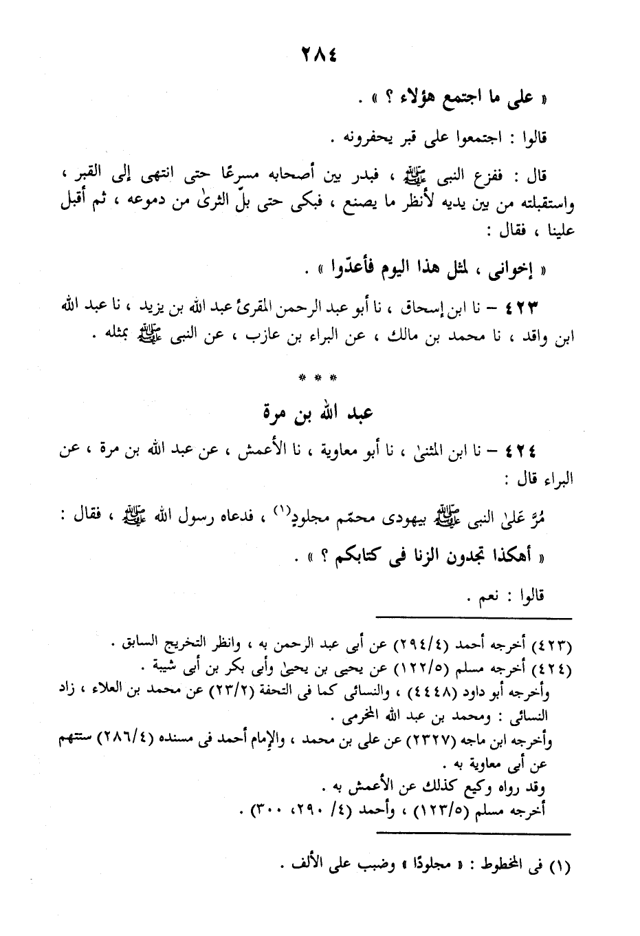 424 - نا الْمُثَنَّى، نا أَبُو مُعَاوِيَةَ، نا الْأَعْمَشُ، عَنْ عَبْدِ اللَّهِ بْنِ مَرَّةَ، عَنِ الْبَرَاءِ قَالَ: مُرَّ عَلَى النَّبِيِّ صَلَّى اللهُ عَلَيْهِ وَسَلَّمَ بِيَهُودِيٍّ مُحَمَّمٍ مَجْلُودٍ، فَدَعَاهُ رَسُولُ اللَّهِ صَلَّى اللهُ عَلَيْهِ وَسَلَّمَ فَقَالَ: «أَهَكَذَا تَجِدُونَ الزِّنَا فِي كِتَابِكُمْ» قَالُوا: نَعَمْ -[285]-، قَالَ: فَدَعَا رَجُلًا مِنْ عُلَمَائِهِمْ فَقَالَ: «أَنْشُدُكَ بِاللَّهِ الَّذِي أَنْزَلَ التَّوْرَاةَ عَلَى مُوسَى، §أَهَكَذَا تَجِدُونَ حَدَّ الزِّنَا فِي كِتَابِكُمْ؟» قَالَ: لَا، وَلَوْلَا أَنَّكَ نَشَدْتَنِي بِهَذَا لَمْ أُخْبِرْكَ، نَجِدُ الزِّنَا فِي كِتَابِنَا: الرَّجْمَ، وَلَكِنْ كَثُرَ فِي أَشْرَافِنَا، فَكُنَّا إِذَا أَخَذْنَا الشَّرِيفَ تَرَكْنَاهُ وَإِذَا أَخَذْنَا الضَّعِيفَ أَقَمْنَا عَلَيْهِ الْحَدَّ، فَقُلْنَا: تَعَالَوْا فَلِنُجْمِعْ عَلَى شَيْءٍ نُقِيمُهُ عَلَى الشَّرِيفِ وَالْوَضِيعِ، فَاجْتَمَعْنَا عَلَى التَّحْمِيمِ وَالْجَلْدِ مَكَانَ الرَّجْمِ، قَالَ رَسُولُ اللَّهِ: «اللَّهُمَّ إِنِّي أَوَّلُ مَنْ أَحْيَا أَمْرَكَ إِذْ أَمَاتُوهُ» فَأَمَرَ فَرُجِمَ، فَأَنْزَلَ اللَّهُ {يَا أَيُّهَا الرَّسُولُ لَا يَحْزُنْكَ الَّذِينَ يُسَارِعُونَ} [المائدة: 41] إِلَى قَوْلِهِ {إَنْ أُوتِيتُمْ هَذَا فَخُذُوهُ} [المائدة: 41] يَقُولُونَ: ائْتُوا مُحَمَّدًا، فَإِنْ أَفْتَاكُمْ بِالتَّحْمِيمِ وَالْجَلْدِ فَخُذُوهُ، وَإِنْ أَفْتَاكُمْ بِالرَّجْمِ فَاحْذَرُوهُ. إِلَى قَوْلِهِ {وَمَنْ لَمْ يَحْكُمْ بِمَا أَنْزَلَ اللَّهُ فَأُولَئِكِ هُمُ الْفَاسِقُونَ} [المائدة: 47] قَالَ: هَذِهِ فِي الْكُفَّارِ كُلُّهَا "