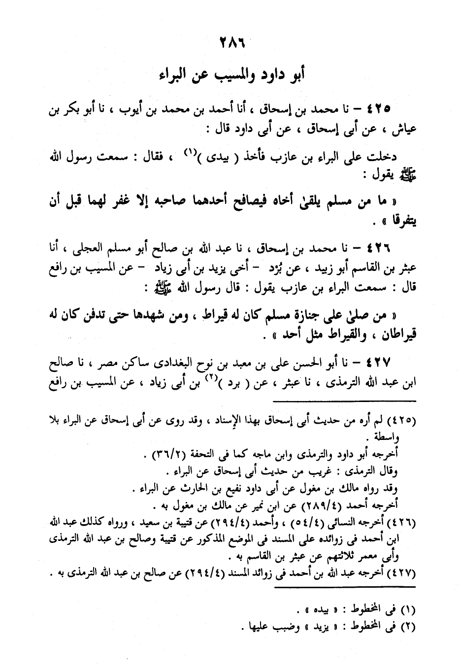 425 - نا مُحَمَّدُ بْنُ إِسْحَاقَ، أنا أَحْمَدُ بْنُ مُحَمَّدِ بْنِ أَيُّوبَ، نا أَبُو بَكْرِ بْنِ عَيَّاشٍ، عَنْ أَبِي إِسْحَاقَ، عَنْ أَبِي دَاوُدَ قَالَ: دَخَلْتُ عَلَى الْبَرَاءِ بْنِ عَازِبٍ فَأَخَذَ بِيَدِي فَقَالَ: سَمِعْتُ رَسُولَ اللَّهِ صَلَّى اللهُ عَلَيْهِ وَسَلَّمَ يَقُولُ: «§مَا مِنْ مُسْلِمٍ يَلْقَى أَخَاهُ فَيُصَافِحُ أَحَدُهُمَا صَاحِبَهُ إِلَّا غُفِرَ لَهُمَا قَبْلَ أَنْ يَتَفَرَّقَا»