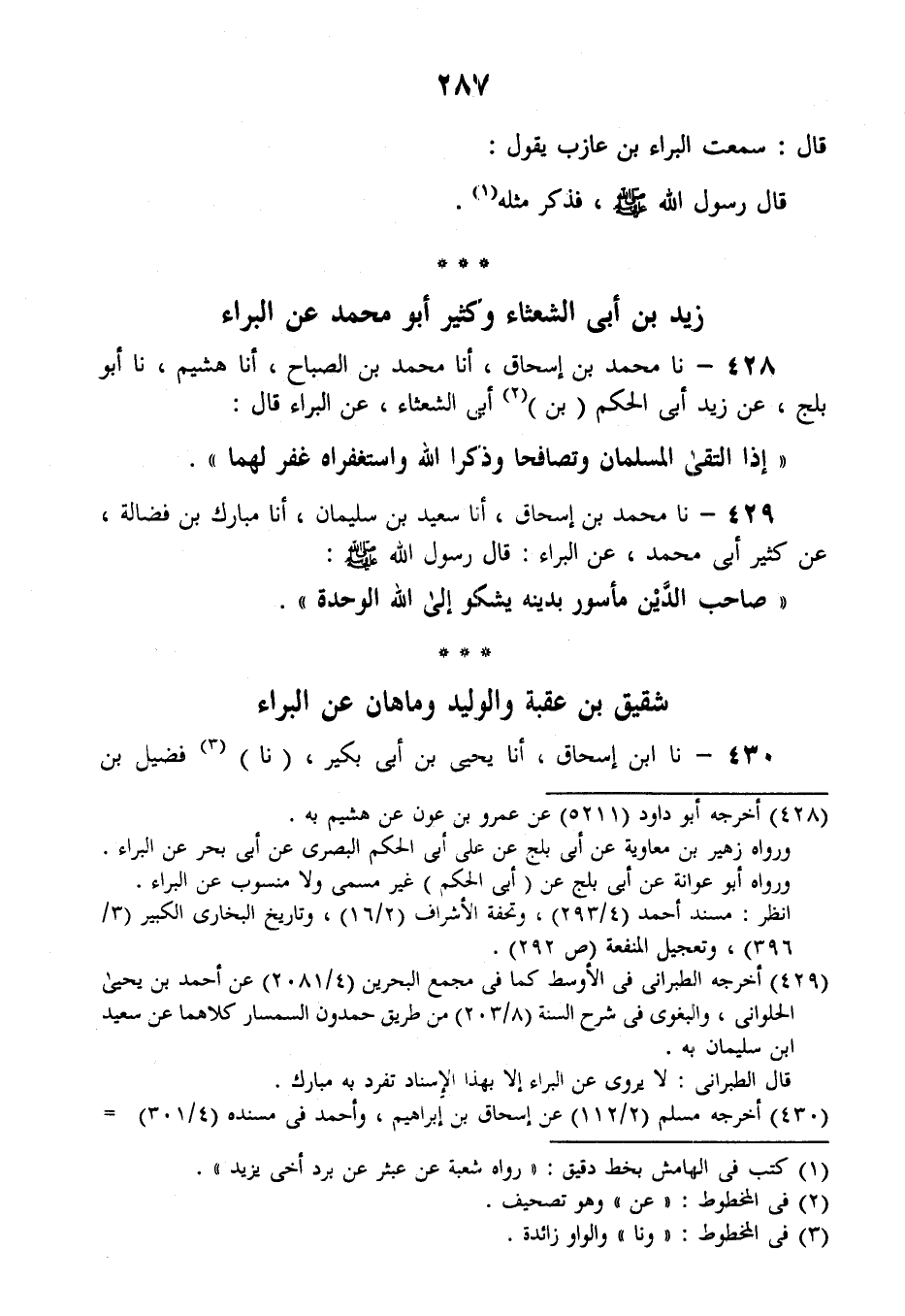 428 - نا مُحَمَّدُ بْنُ إِسْحَاقَ، أنا مُحَمَّدُ بْنُ الصَّبَّاحِ، أنا هُشَيْمٌ، نا أَبُو بَلْجٍ، عَنْ زَيْدِ أَبِي الْحَكَمِ بْنِ أَبِي الشَّعْثَاءِ، عَنِ الْبَرَاءِ قَالَ: «§إِذَا الْتَقَى الْمُسْلِمَانِ وتَصَافَحَا وَذَكَرَا اللَّهَ وَاسْتَغْفَرَاهُ غُفِرَ لَهُمَا»