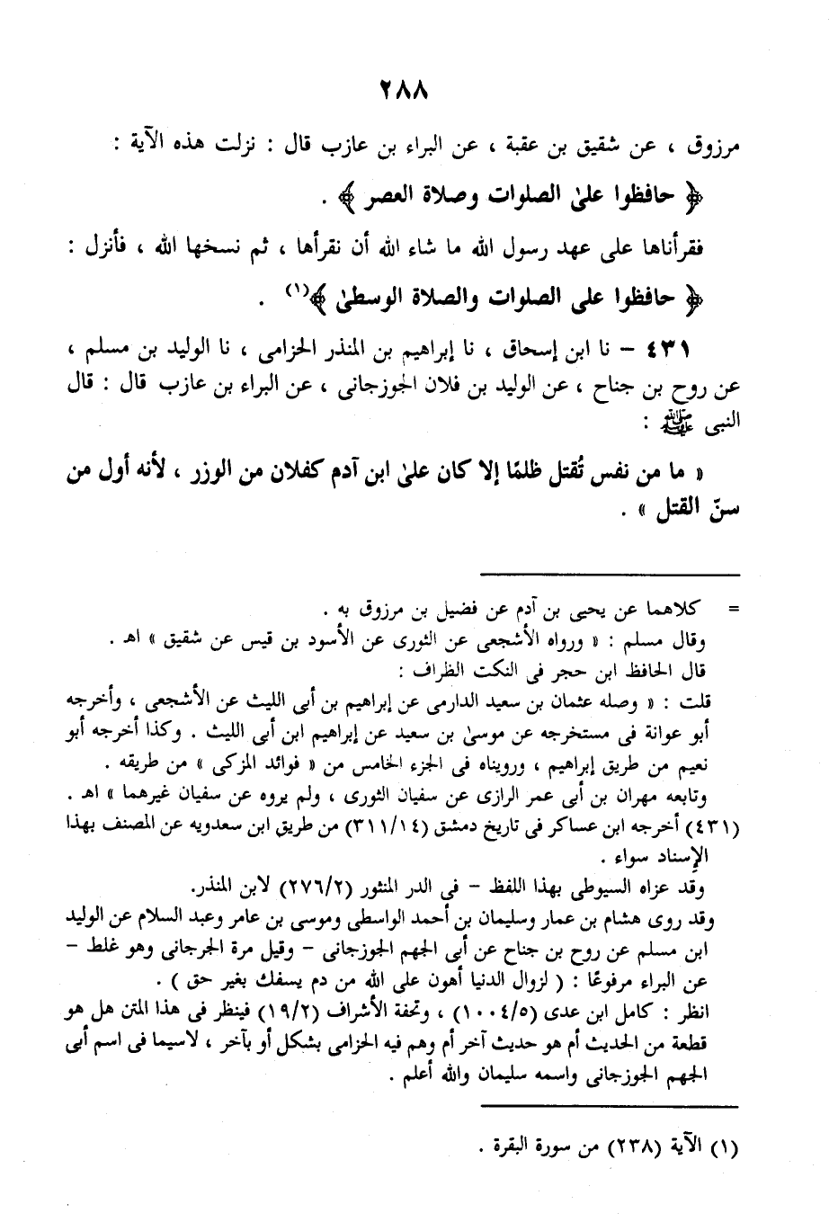 431 - نا ابْنُ إِسْحَاقَ، نا إِبْرَاهِيمُ بْنُ الْمُنْذِرِ الْحِزَامِيُّ، نا الْوَلِيدُ بْنُ مُسْلِمٍ، عَنْ رَوْحِ بْنِ جُنَاحٍ، عَنِ الْوَلِيدِ بْنِ فُلَانٍ الْجَوْزَجَانِيِّ، عَنِ الْبَرَاءِ بْنِ عَازِبٍ قَالَ: قَالَ النَّبِيُّ صَلَّى اللهُ عَلَيْهِ وَسَلَّمَ: «§مَا مِنْ نَفْسٍ تُقْتَلُ ظُلْمًا إِلَّا كَانَ عَلَى ابْنِ آدَمَ كِفْلَانِ مِنَ الْوِزْرِ؛ لِأَنَّهُ أَوَّلُ مَنْ سَنَّ الْقَتْلَ»