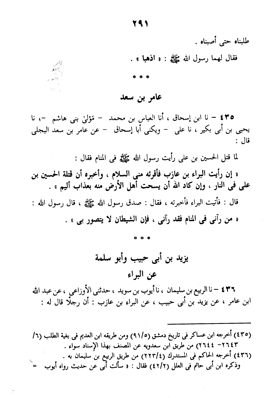 نا ابْنُ إِسْحَاقَ، أنا الْعَبَّاسُ بْنُ مُحَمَّدٍ مَوْلَى بَنِي هَاشِمٍ، نا يَحْيَى بْنُ أَبِي بُكَيْرٍ، نا عَلِيٌّ وَيُكْنَى أَبَا إِسْحَاقَ، عَنْ عَامِرِ بْنِ سَعْدٍ الْبَجَلِيِّ قَالَ: لَمَّا قُتِلَ الْحُسَيْنُ بْنُ عَلِيٍّ رَأَيْتُ رَسُولَ اللَّهِ صَلَّى اللهُ عَلَيْهِ وَسَلَّمَ فِي الْمَنَامِ فَقَالَ: «إنْ رَأَيْتَ الْبَرَاءَ بْنَ عَازِبٍ فَأَقْرِئْهُ مِنِّي السَّلَامَ، وَأخْبِرْهُ أَنَّ قَتَلَةَ الْحُسَيْنِ بْنِ عَلِيٍّ فِي النَّارِ، وَإِنْ كَادَ اللَّهُ أَنْ يُسْحِتَ أَهْلَ الْأَرْضِ مِنْهُ بِعَذَابٍ أَلِيمٍ» قَالَ: فَأَتَيْتُ الْبَرَاءَ فَأَخْبَرْتُهُ فَقَالَ: صَدَقَ رَسُولُ اللَّهِ صَلَّى اللهُ عَلَيْهِ وَسَلَّمَ، قَالَ رَسُولُ اللَّهِ: «§مَنْ رَآنِي فِي الْمَنَامِ فَقَدْ رَآنِي، فَإِنَّ الشَّيْطَانَ لَا يَتَصَوَّرُ بِي»