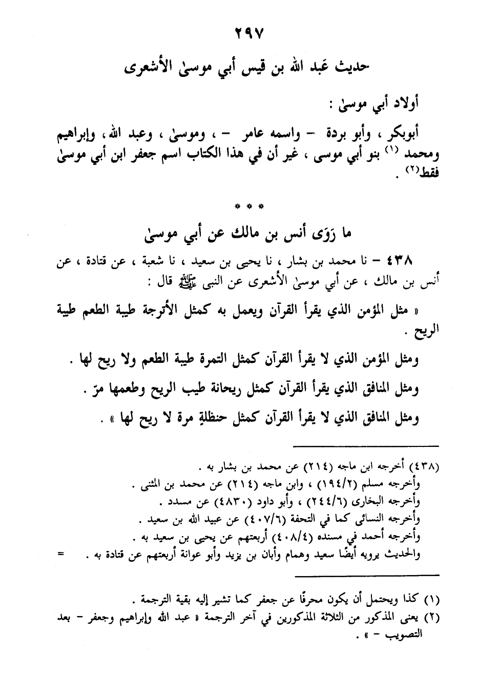 438 - نا مُحَمَّدُ بْنُ بَشَّارٍ، نا يَحْيَى بْنُ سَعِيدٍ، نا شُعْبَةُ، عَنْ قَتَادَةَ، عَنْ أَنَسِ بْنِ مَالِكٍ، عَنْ أَبِي مُوسَى الْأَشْعَرِيِّ، عَنِ النَّبِيِّ صَلَّى اللهُ عَلَيْهِ وَسَلَّمَ قَالَ: «§مِثَلُ الْمُؤْمِنِ الَّذِي يَقْرَأُ الْقُرْآنَ وَيَعْمَلُ بِهِ كَمَثَلِ الْأُتْرُجَّةِ طَيِّبَةُ الطَّعْمِ طَيِّبَةُ الرِّيحِ، وَمَثَلُ الْمُؤْمِنِ الَّذِي لَا يَقْرَأُ الْقُرْآنَ كَمَثَلِ التَّمْرَةِ طَيِّبَةُ الطَّعْمِ وَلَا رِيحَ لَهَا، وَمَثَلُ الْمُنَافِقِ الَّذِي يَقْرَأُ الْقُرْآنَ كَمَثَلِ رَيْحَانَةٍ طَيِّبَةِ الرِّيحِ وَطَعْمُهَا مُرٌّ، وَمَثَلُ الْمُنَافِقِ الَّذِي لَا يَقْرَأُ الْقُرْآنَ كَمَثَلِ حَنْظَلَةٍ مُرَّةٍ لَا رِيحَ لَهَا»