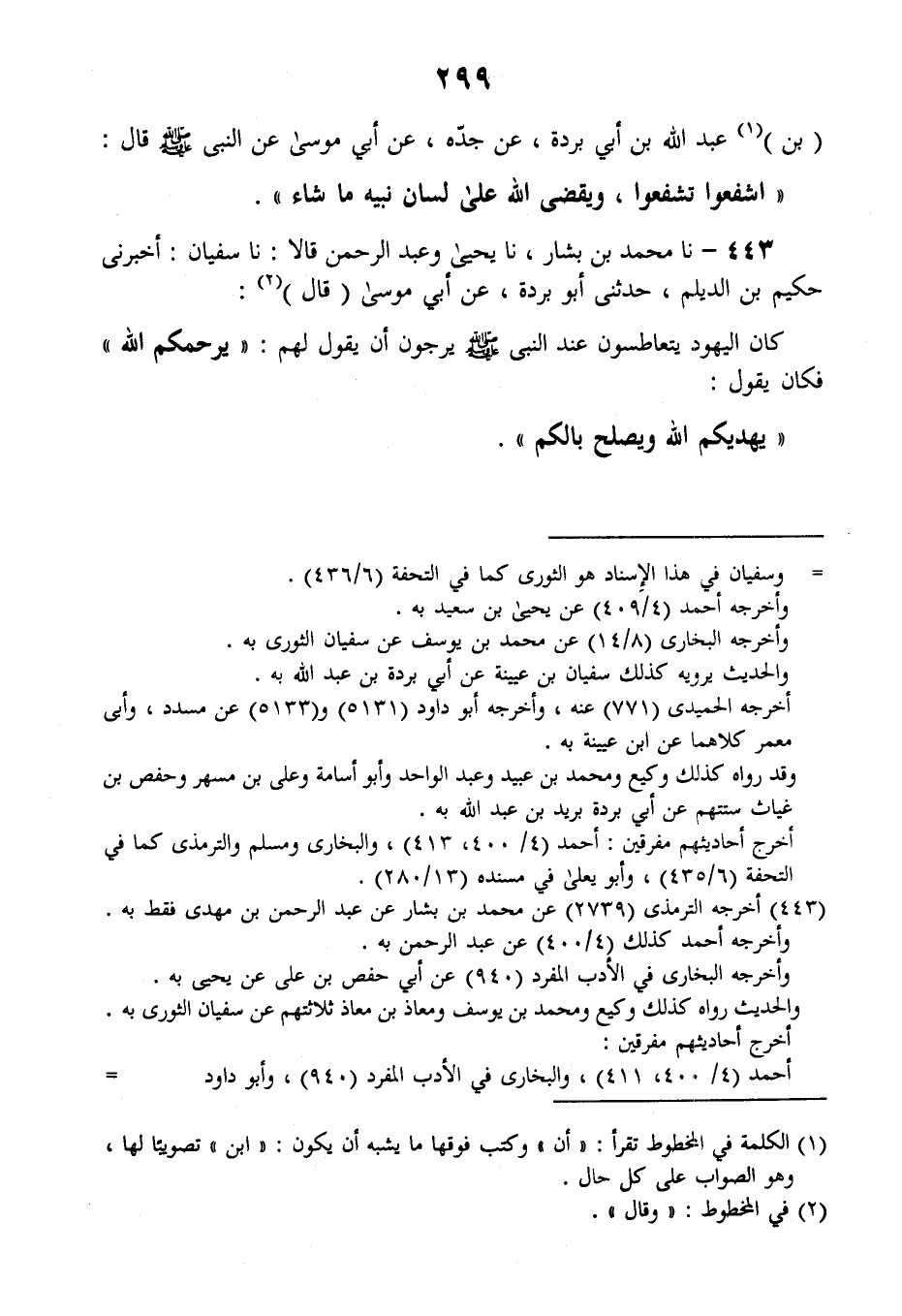 443 - نا مُحَمَّدُ بْنُ بَشَّارٍ، نا يَحْيَى وَعَبْدُ الرَّحْمَنِ قَالَا: نا سُفْيَانُ، أَخْبَرَنِي حَكِيمُ بْنُ الدَّيْلَمِ، حَدَّثَنِي أَبُو بُرْدَةَ، عَنْ أَبِي مُوسَى قَالَ: " §كَانَ الْيَهُودُ يَتَعَاطَسُونَ عِنْدَ النَّبِيِّ صَلَّى اللهُ عَلَيْهِ وَسَلَّمَ يَرْجُونَ أَنْ يَقُولَ لَهُمْ: «يَرْحَمُكُمُ اللَّهُ» فَكَانَ يَقُولُ: «يَهْدِيكُمُ اللَّهُ وَيُصْلِحُ بَالَكُمْ»