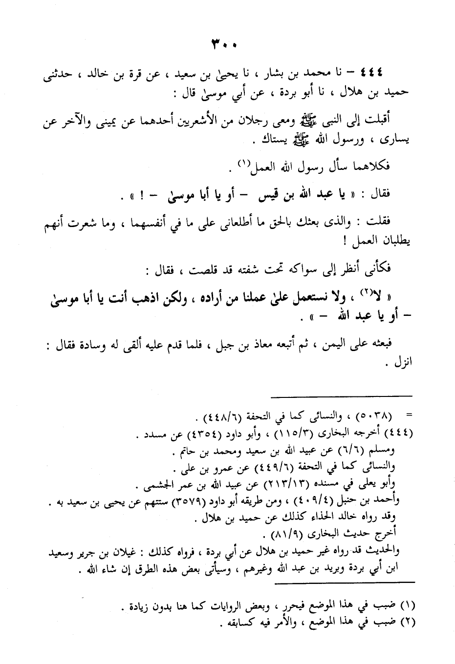 444 - نا مُحَمَّدُ بْنُ بَشَّارٍ، نا يَحْيَى بْنُ سَعِيدٍ، عَنْ قُرَّةَ بْنِ خَالِدٍ، حَدَّثَنِي حُمَيْدُ بْنُ هِلَالٍ، نا أَبُو بُرْدَةَ، عَنْ أَبِي مُوسَى قَالَ: أَقْبَلْتُ إِلَى النَّبِيِّ صَلَّى اللهُ عَلَيْهِ وَسَلَّمَ وَمَعِي رَجُلَانِ مِنَ الْأَشْعَرِيِينَ، أَحَدُهُمَا عَنْ يَمِينِي وَالْآخَرُ عَنْ يَسَارِي وَرَسُولُ اللَّهِ صَلَّى اللهُ عَلَيْهِ وَسَلَّمَ يَسْتَاكُ، فَكِلَاهُمَا سَأَلَ رَسُولَ اللَّهِ الْعَمَلَ، فَقَالَ: «يَا عَبْدَ اللَّهِ بْنَ قَيْسٍ - أَوْ يَا أَبَا مُوسَى -» فَقُلْتُ: وَالَّذِي بَعَثَكَ بِالْحَقِّ مَا أَطْلَعَانِي عَلَى مَا فِي أَنْفُسِهِمَا، وَمَا شَعَرْتُ أَنَّهُمْ يَطْلُبَانِ الْعَمَلَ، فَكَأَنِّي أَنْظُرُ إِلَى سِوَاكِهِ تَحْتَ شَفَتِهِ قَدْ قَلَصَتْ، فَقَالَ: «§لَا وَلَا نَسْتَعْمِلُ عَلَى عَمَلِنَا مَنْ أَرَادَهُ، وَلَكِنِ اذْهَبْ أَنْتَ يَا أَبَا مُوسَى - أَوْ يَا عَبْدَ اللَّهِ» فَبَعَثَهُ عَلَى الْيَمَنِ ثُمَّ أَتْبَعَهُ مُعَاذَ بْنَ جَبَلٍ، فَلَمَّا قَدِمَ عَلَيْهِ أَلْقَى لَهُ وِسَادَةً فَقَالَ: انْزِلْ -[301]-، فَإِذَا رَجُلٌ عِنْدَهُ مُوثَقٌ فِي الْحَدِيدِ، فَقَالَ: مَا هَذَا؟ قَالَ: كَانَ يَهُودِيًّا فَأَسْلَمَ ثُمَّ رَاجِعَ دِينَهُ - دَيْنَ السُّوءِ - فَتَهَوَّدَ، قَالَ: لَا أجْلِسُ حَتَّى يُقْتَلَ، قَضَاءُ اللَّهِ وَرَسُولِهِ - ثَلَاثَ مِرَارٍ - فَأَمَرَ بِهِ فَقُتِلَ، ثُمَّ تَذَاكَرَا قِيَامَ اللَّيْلِ، فَقَالَ أَحَدُهُمَا - مُعَاذٌ -: أَمَّا أنَا فَأَنَامُ وأقُومُ وأرْجُو فِي نَوْمَتِي مَا أَرْجُو فِي قَوْمَتِي "