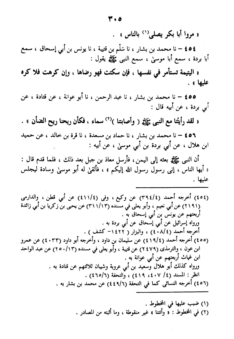 454 - نا مُحَمَّدُ بْنُ بَشَّارٍ، نا سَلْمُ بْنُ قُتَيْبَةَ، نا يُونُسُ بْنُ أَبِي إِسْحَاقَ، سَمِعَ أَبَا بُرْدَةَ، سَمِعَ أَبَا مُوسَى، سَمِعَ النَّبِيَّ صَلَّى اللهُ عَلَيْهِ وَسَلَّمَ يَقُولُ: «§الْيَتِيمَةُ تُسْتَأْمَرُ فِي نَفْسِهَا، فَإِنْ سَكَتَتْ فَهُوَ رِضَاهَا، وَإِنْ كَرِهَتْ فَلَا كُرْهَ عَلَيْهَا»
