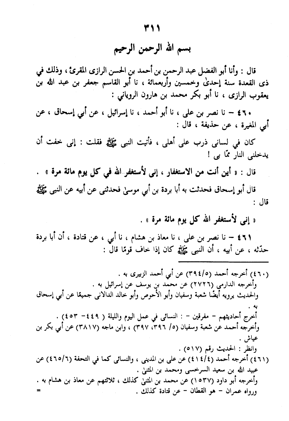 قَالَ: وَأَنَا أَبُو الْفَضْلِ عَبْدُ الرَّحْمَنِ بْنُ أَحْمَدَ بْنِ الْحَسَنِ الرَّازِي الْمُقْرِئُ وَذَلِكَ فِي ذِي الْقَعْدَةِ سَنَةَ إِحْدَى وَخَمْسِينَ وَأَرْبَعِمِائَةٍ، نَا أَبُو الْقَاسِمِ جَعْفَرُ بْنُ عَبْدِ اللَّهِ بْنِ يَعْقُوبَ الرَّازِيُّ، نَا أَبُو بَكْرٍ مُحَمَّدُ بْنُ هَارُونَ الرُّويَانِيُّ، نَا نَصْرُ بْنُ عَلِيٍّ، نا أَبُو أَحْمَدَ، نا إِسْرَائِيلُ، عَنْ أَبِي إِسْحَاقَ، عَنْ أَبِي الْمُغِيرَةِ، عَنْ حُذَيْفَةَ قَالَ: كَانَ فِي لِسَانِي ذَرَبٌ عَلَى أَهْلِي فَأَتَيْتُ النَّبِيَّ صَلَّى اللهُ عَلَيْهِ وَسَلَّمَ فَقُلْتُ: إِنِّي خِفْتُ أَنْ يُدْخِلَنِي النَّارَ مِمَّا بِي، قَالَ: «§أَيْنَ أَنْتَ مِنَ الْأسْتِغْفَارِ؟ إِنِّي لَأَسْتَغْفِرُ اللَّهَ فِي كُلِّ يَوْمٍ مِائَةَ مَرَّةٍ» قَالَ أَبُو إِسْحَاقَ: فَحَدَّثْتُ بِهِ أَبَا بُرْدَةَ بْنَ أَبِي مُوسَى فَحَدَّثَنِي عَنْ أَبِيهِ، عَنِ النَّبِيِّ صَلَّى اللهُ عَلَيْهِ وَسَلَّمَ قَالَ: «إِنِّي لَأَسْتَغْفِرُ اللَّهَ كُلَّ يَوْمٍ مِائَةَ مَرَّةٍ»