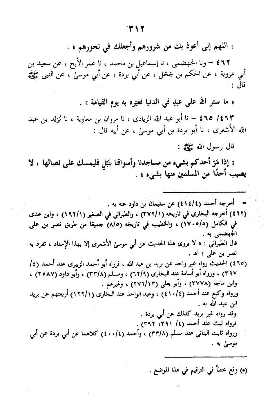 463 - نا أَبُو عَبْدِ اللَّهِ الزِّيَادِيُّ، نا مَرْوَانُ بْنُ مُعَاوِيَةَ، نا بُرَيْدُ بْنُ عَبْدِ اللَّهِ الْأَشْعَرِيُّ، نا أَبُو بُرْدَةَ بْنِ أَبِي مُوسَى، عَنْ أَبِيهِ، قَالَ: قَالَ رَسُولُ اللَّهِ صَلَّى اللهُ عَلَيْهِ وَسَلَّمَ: «§إِذَا مَرَّ أَحَدُكُمْ بِشَىْءٍ مِنْ مَسَاجِدِنَا وَأَسْوَاقِنَا بِنَبْلٍ فَلْيُمْسِكْ عَلَى نِصَالِهَا؛ لَا يُصِيبُ أَحَدًا مِنَ الْمُسْلِمِينَ مِنْهَا بِشَيْءٍ»