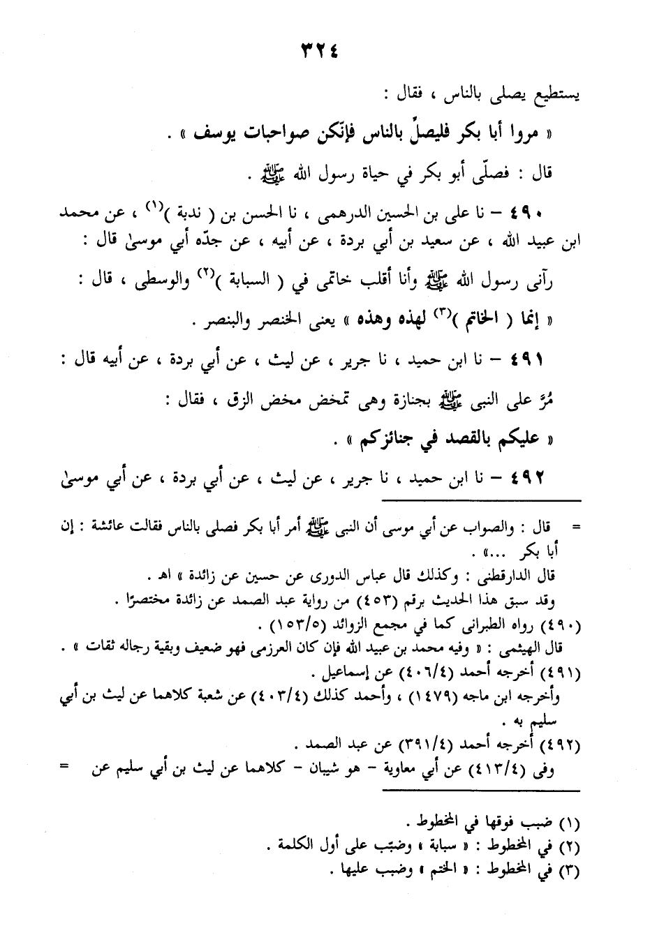 491 - نا ابْنُ حُمَيْدٍ، نا جَرِيرٌ، عَنْ لَيْثٍ، عَنْ أَبِي بُرْدَةَ، عَنْ أَبِيهِ قَالَ: مُرَّ عَلَى النَّبِيِّ صَلَّى اللهُ عَلَيْهِ وَسَلَّمَ بِجِنَازَةٍ وَهِيَ تُمْخَضُ مَخْضَ الزِّقِّ فَقَالَ: «§عَلَيْكُمْ بِالْقَصْدِ فِي جَنَائِزِكُمْ»