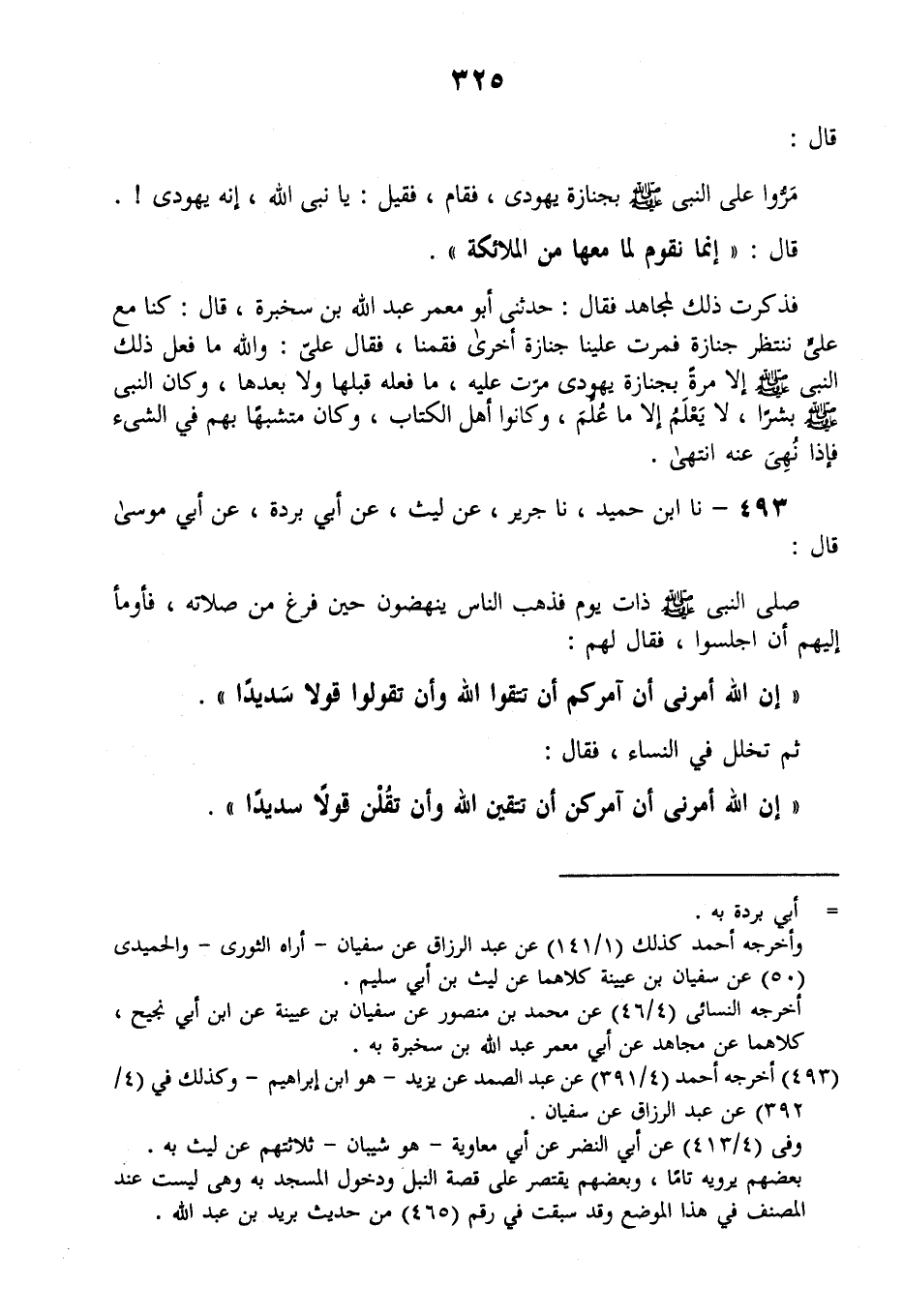 493 - نا ابْنُ حُمَيْدٍ، نا جَرِيرٌ، عَنْ لَيْثٍ، عَنْ أَبِي بُرْدَةَ، عَنْ أَبِي مُوسَى قَالَ: صَلَّى النَّبِيُّ صَلَّى اللهُ عَلَيْهِ وَسَلَّمَ ذَاتَ يَوْمٍ، فَذَهَبَ النَّاسُ يَنْهَضُونَ حِينَ فَرَغَ مِنْ صَلَاتِهِ، فَأَوْمَأَ إِلَيْهِمْ: أَنِ اجْلِسُوا، فَقَالَ لَهُمْ: «إنَّ اللَّهَ أَمَرَنِي أَنْ آمُرَكُمْ أَنْ تَتَّقُوا اللَّهَ وَأَنْ تَقُولُوا قَوْلًا سَدِيدًا» ثُمَّ تَخَلَّلَ فِي النِّسَاءِ فَقَالَ: «§إنَّ اللَّهَ أَمَرَنِي أَنْ آمُرَكُنَّ أَنْ تَتَّقِينَ اللَّهَ، وَأَنْ تَقُلْنَ قَوْلًا سَدِيدًا»