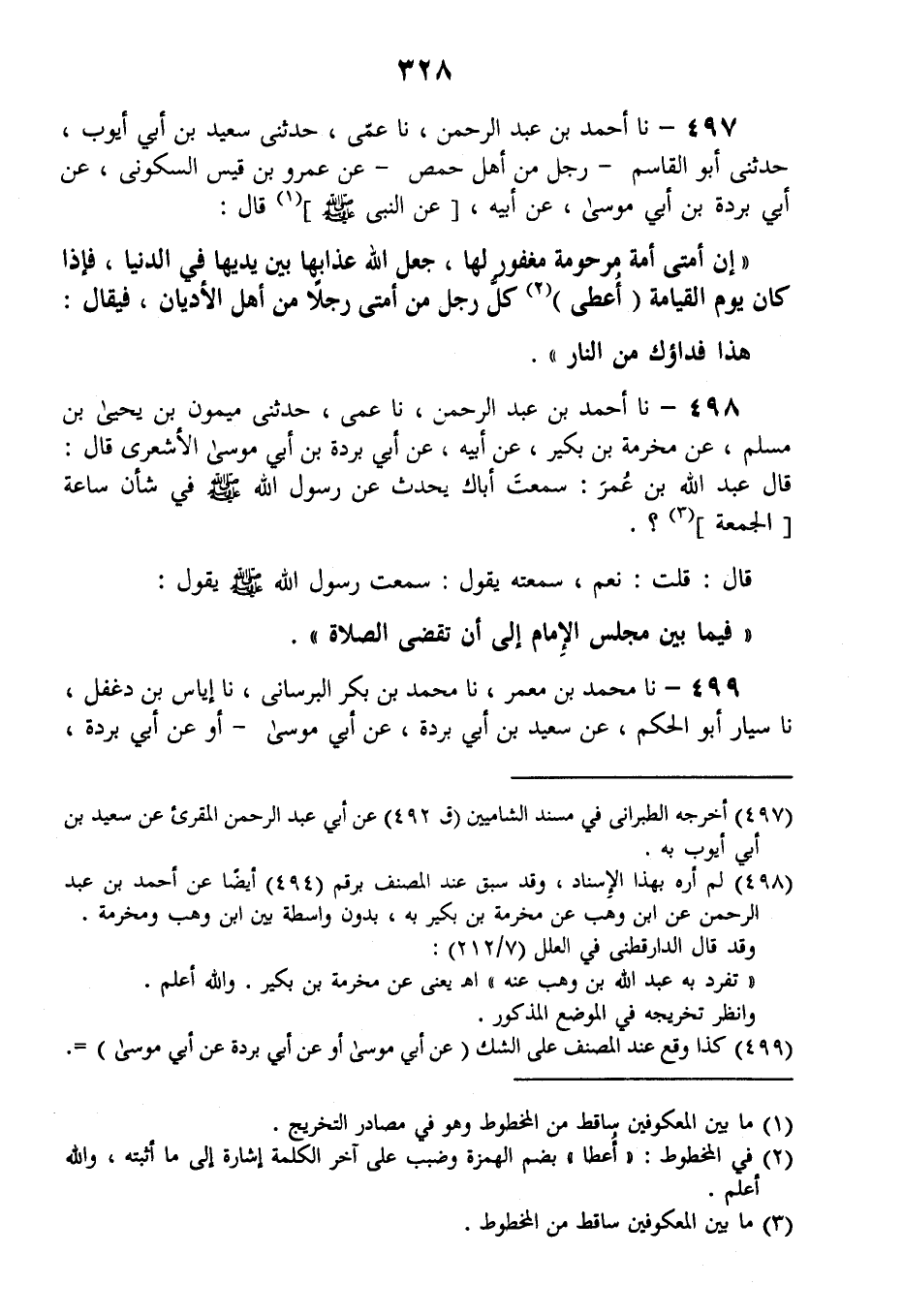497 - نا أَحْمَدُ بْنُ عَبْدِ الرَّحْمَنِ، نا عَمِّي، حَدَّثَنِي سَعِيدُ بْنُ أَبِي أَيُّوبَ، حَدَّثَنِي أَبُو الْقَاسِمِ - رَجُلٌ مِنْ أَهْلِ حِمْصٍ - عَنْ عَمْرِو بْنِ قَيْسٍ السَّكُونِيِّ، عَنْ أَبِي بُرْدَةَ بْنِ أَبِي مُوسَى، عَنْ أَبِيهِ، عَنِ النَّبِيِّ صَلَّى اللهُ عَلَيْهِ وَسَلَّمَ قَالَ: " §إنَّ أُمَّتِي أُمَّةٌ مَرْحُومَةٌ، مَغْفُورٌ لَهَا، جَعَلَ اللَّهُ عَذَابَهَا بَيْنَ يَدَيْهَا فِي الدُّنْيَا، فَإِذَا كَانَ يَوْمُ الْقِيَامَةِ أُعْطِيَ كُلُّ رَجُلٍ مِنْ أُمَّتِي رَجُلًا مِنْ أَهْلِ الْأَدْيَانِ فَيُقَالُ: هَذَا فِدَاؤُكَ مِنَ النَّارِ "