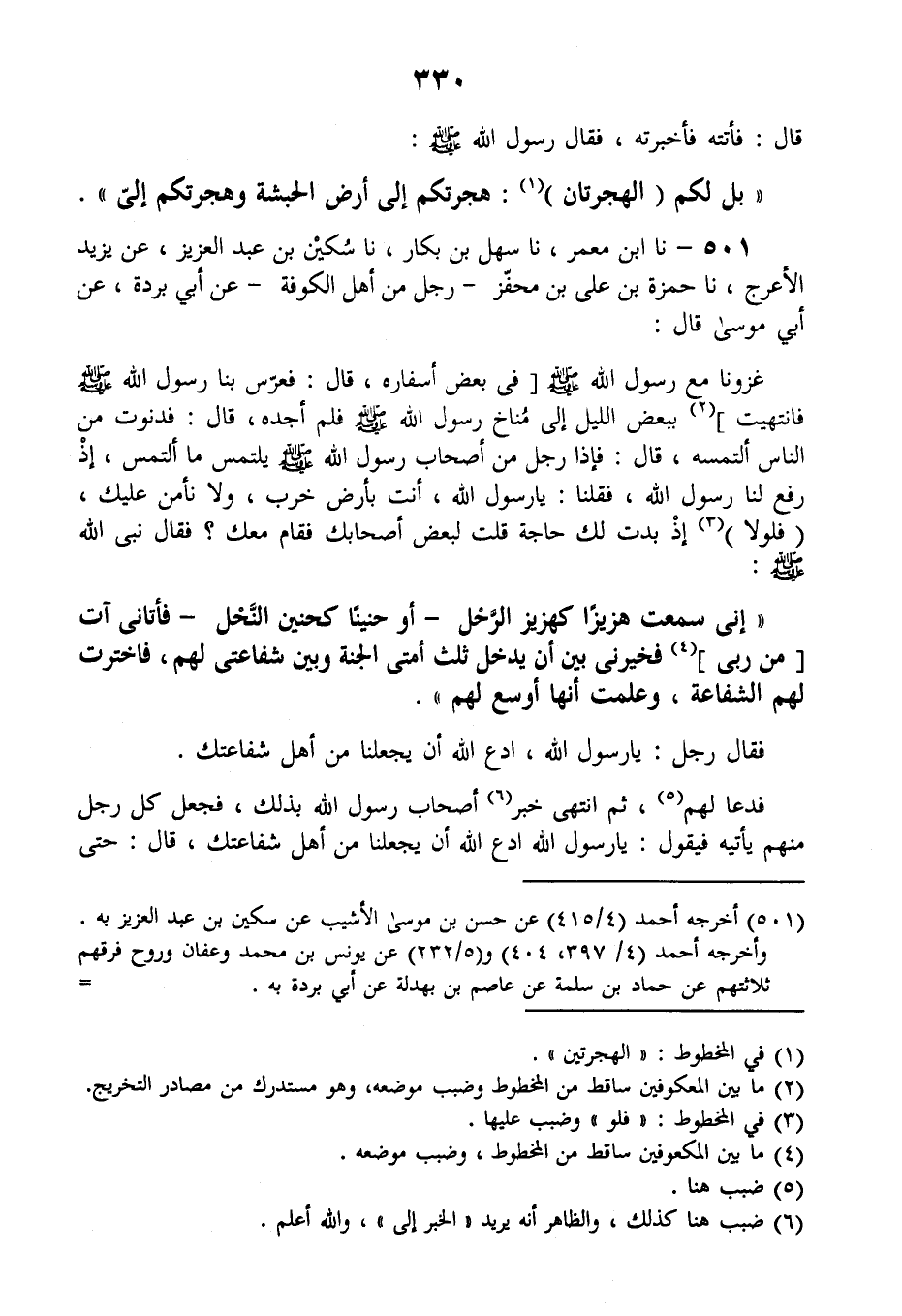 501 - نا ابْنُ مَعْمَرٍ، نا سَهْلُ بْنُ بَكَّارٍ، نا سُكَيْنُ بْنُ عَبْدِ الْعَزِيزِ، عَنْ يَزِيدَ الْأَعْرَجِ، نا حَمْزَةُ بْنُ عَلِيِّ بْنِ مَحْفَزٍ - رَجُلٌ مِنْ أَهْلِ الْكُوفَةِ -، عَنْ أَبِي بُرْدَةَ، عَنْ أَبِي مُوسَى قَالَ: غَزَوْنَا مَعَ رَسُولِ اللَّهِ صَلَّى اللهُ عَلَيْهِ وَسَلَّمَ فِي بَعْضِ أَسْفَارِهِ، قَالَ: فَعَرَّسَ بِنَا رَسُولُ اللَّهِ صَلَّى اللهُ عَلَيْهِ وَسَلَّمَ، فَانْتَهَيْتُ بِبَعْضِ اللَّيْلِ إِلَى مُنَاخِ رَسُولِ اللَّهِ صَلَّى اللهُ عَلَيْهِ وَسَلَّمَ فَلَمْ أَجِدْهُ، قَالَ: فَدَنَوْتُ مِنَ النَّاسِ أَلْتَمِسُهُ، قَالَ: فَإِذَا رَجُلٌ مِنْ أَصْحَابِ رَسُولِ اللَّهِ صَلَّى اللهُ عَلَيْهِ وَسَلَّمَ يَلْتَمِسُ مَا أَلْتَمِسُ، إِذْ رُفِعَ لَنَا رَسُولُ اللَّهِ صَلَّى اللهُ عَلَيْهِ وَسَلَّمَ، فَقُلْنَا: يَا رَسُولَ اللَّهِ، أَنْتَ بِأَرْضٍ خَرِبٍ، وَلَا نَأْمَنُ عَلَيْكَ، فَلَوْلَا إِذْ بَدَتْ لَكَ حَاجَةٌ قُلْتَ لِبَعْضِ أَصْحَابِكَ فَقَامَ مَعَكَ؟ فَقَالَ نَبِيُّ اللَّهِ صَلَّى اللهُ عَلَيْهِ وَسَلَّمَ: «إِنِّي سَمِعْتُ هَزِيزًا كَهَزِيزِ الرَّحْلِ - أَوْ حَنِينًا كَحَنِينِ النَّحْلِ - فَأَتَانِي آتٍ مِنْ رَبِّي فَخَيَّرَنِي بَيْنَ أَنْ يُدْخِلَ ثُلُثَ أُمَّتِي الْجَنَّةَ وَبَيْنَ شَفَاعَتِي لَهُمْ فَاخْتَرْتُ لَهُمُ الشَّفَاعَةَ، وَعَلِمْتُ أَنَّهَا أَوْسَعُ لَهُمْ» فَقَالَ رَجُلٌ: يَا رَسُولَ اللَّهِ، ادْعُ اللَّهَ أَنْ يَجْعَلَنَا مِنْ أَهْلِ شَفَاعَتِكَ، فَدَعَا لَهُمْ. ثُمَّ انْتَهَى خَبَرُ أَصْحَابِ رَسُولِ اللَّهِ صَلَّى اللهُ عَلَيْهِ وَسَلَّمَ بِذَلِكَ، فَجَعَلَ كُلُّ رَجُلٍ مِنْهُمْ يَأْتِيَهِ فَيَقُولُ: يَا رَسُولَ اللَّهِ، §ادْعُ اللَّهَ أَنْ يَجْعَلَنَا مِنْ أَهْلِ شَفَاعَتِكَ، قَالَ: حَتَّى -[331]- أَضَبَّ عَلَيْهِ الْقَوْمُ وَأَكْثَرُوا، فَقَالَ: «إِنَّهَا لِمَنْ مَاتَ يَشْهَدُ أَنَّ لَا إِلَهَ إِلَّا اللَّهُ»