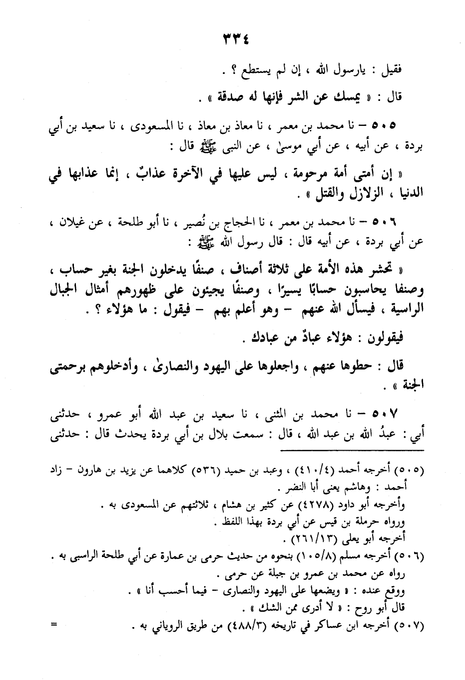 506 - نا مُحَمَّدُ بْنُ مَعْمَرٍ، نا الْحَجَّاجُ بْنُ نُصَيْرٍ، نا أَبُو طَلْحَةَ، عَنْ غَيْلَانَ، عَنْ أَبِي بُرْدَةَ، عَنِ أَبِيهِ، قَالَ: قَالَ رَسُولُ اللَّهِ صَلَّى اللهُ عَلَيْهِ وَسَلَّمَ: " §تُحْشَرُ هَذِهِ الْأُمَّةُ عَلَى ثَلَاثَةِ أَصْنَافٍ: صِنْفٍ يَدْخُلُونَ الْجَنَّةَ بِغَيْرِ حِسَابٍ، وَصِنْفٍ يُحَاسَبُونَ حِسَابًا يَسِيرًا، وَصِنْفٍ يَجِيئُونَ عَلَى ظُهُورِهِمْ أَمْثَالُ الْجِبَالِ الرَّاسِيَةِ، فَيَسْأَلُ اللَّهُ عَنْهُمْ وَهُوَ أَعْلَمُ بِهِمْ فَيَقُولُ: مَا هَؤُلَاءِ؟ فَيَقُولُونَ: هَؤُلَاءِ عِبَادٌ مِنْ عِبَادِكِ، قَالَ: حُطُّوها عَنْهُمْ وَاجْعَلُوهَا عَلَى الْيَهُودِ وَالنَّصَارَى، وَأَدْخِلُوهُمْ بِرَحْمَتِي الْجَنَّةَ "