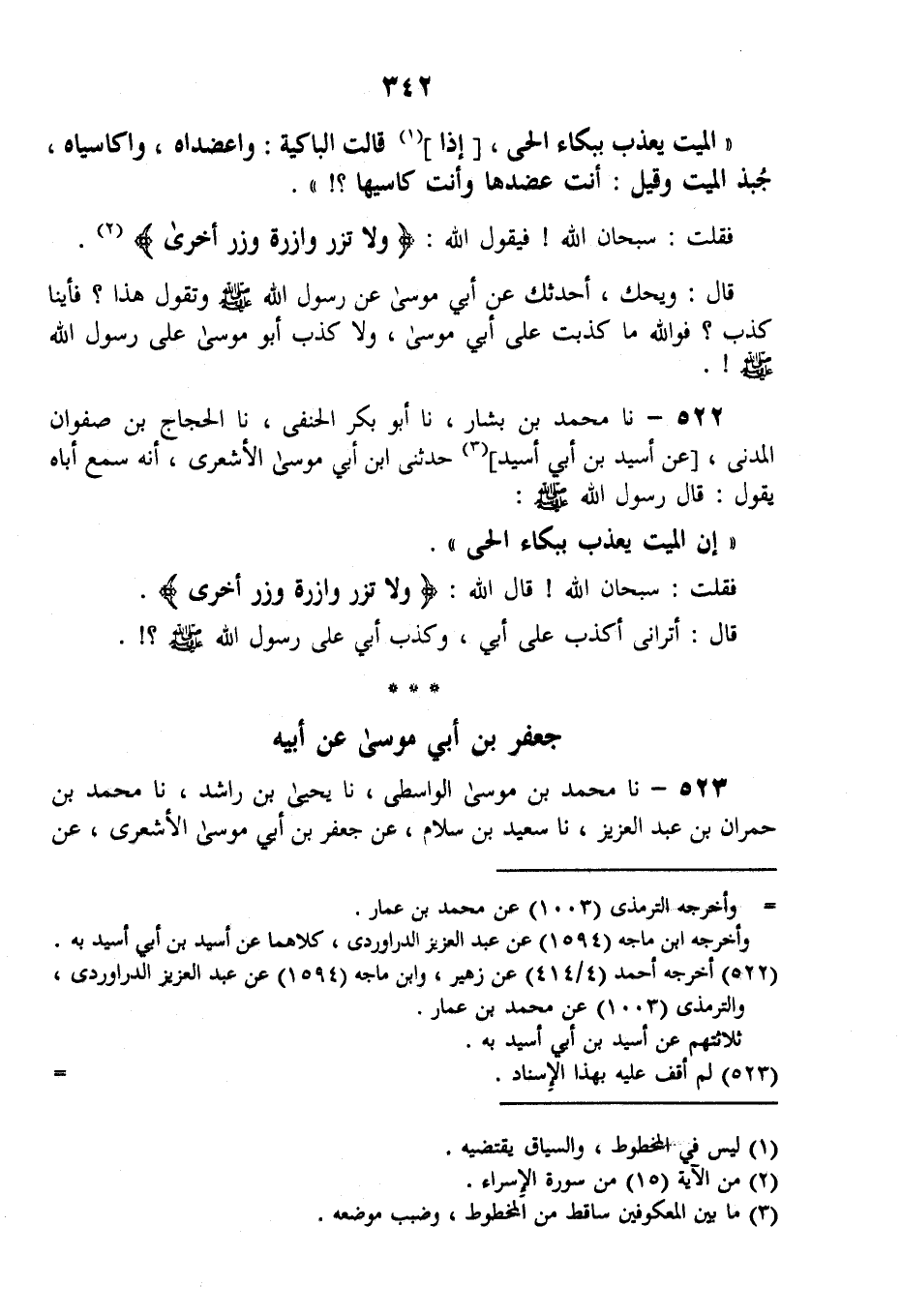522 - نا مُحَمَّدُ بْنُ بَشَّارٍ، نا أَبُو بَكْرِ الْحَنَفِيُّ، نا الْحَجَّاجُ بْنُ صَفْوَانَ الْمَدَنِيُّ، عَنْ أُسَيْدِ بْنِ أَبِي أُسَيْدٍ، حَدَّثَنِي ابْنُ أَبِي مُوسَى الْأَشْعَرِيِّ: أَنَّهُ سَمِعَ أَبَاهُ، يَقُولُ: قَالَ رَسُولُ اللَّهِ صَلَّى اللهُ عَلَيْهِ وَسَلَّمَ: «§إنَّ الْمَيِّتَ يُعَذَّبُ بِبُكَاءِ الْحَيِّ» فَقُلْتُ: سُبْحَانَ اللَّهِ، قَالَ اللَّهُ: {وَلَا تَزِرُ وَازِرَةٌ وِزْرَ أُخْرَى} [الأنعام: 164] قَالَ: أَتُرَانِي أَكْذَبُ عَلَى أَبِي، وَكَذَبَ أَبِي عَلَى رَسُولِ اللَّهِ صَلَّى اللهُ عَلَيْهِ وَسَلَّمَ؟