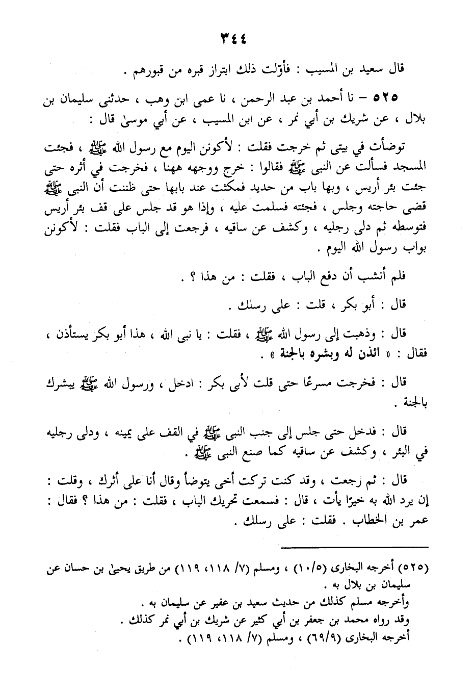 نا أَحْمَدُ بْنُ عَبْدِ الرَّحْمَنِ، نا عَمِّي ابْنُ وَهْبٍ، حَدَّثَنِي سُلَيْمَانُ بْنُ بِلَالٍ، عَنْ شَرِيكِ بْنِ أَبِي نَمِرٍ، عَنِ ابْنِ الْمُسَيِّبِ، عَنْ أَبِي مُوسَى قَالَ: تَوَضَّأْتُ فِي بَيْتِي ثُمَّ خَرَجْتُ فَقُلْتُ: لَأَكُونَنَّ الْيَوْمَ مَعَ رَسُولِ اللَّهِ صَلَّى اللهُ عَلَيْهِ وَسَلَّمَ، فَجِئْتُ الْمَسْجِدَ فَسَأَلْتُ عَنِ النَّبِيِّ صَلَّى اللهُ عَلَيْهِ وَسَلَّمَ، فَقَالُوا: خَرَجَ وَوَجْهُهُ هَاهُنَا، فَخَرَجْتُ فِي أَثَرِهِ حَتَّى جِئْتُ بِئْرَ أَرِيسٍ وَبِهَا بَابٌ مِنْ حَدِيدٍ، فَمَكَثْتُ عِنْدَ بَابِهَا حَتَّى ظَنَنْتُ أَنَّ النَّبِيَّ صَلَّى اللهُ عَلَيْهِ وَسَلَّمَ قَضَى حَاجَتَهُ وَجَلَسَ، فَجِئْتُهُ فَسَلَّمْتُ عَلَيْهِ، وَإِذَا هُوَ قَدْ جَلَسَ عَلَى قُفِّ بِئْرِ أَرِيسٍ فَتَوَسَّطَهُ، ثُمَّ دَلَّى رِجْلَيْهِ وَكَشَفَ عَنْ سَاقَيْهِ، فَرَجَعْتُ إِلَى الْبَابِ فَقُلْتُ لَأَكُونَنَّ بَوَّابَ رَسُولِ اللَّهِ الْيَوْمَ، فَلَمْ أَنْشَبْ أَنْ دُفِعَ الْبَابُ فَقُلْتُ: مَنْ هَذَا؟ قَالَ: أَبُو بَكْرٍ، قُلْتُ: عَلَى رِسْلِكَ، قَالَ: وَذَهَبَتُ إِلَى رَسُولِ اللَّهِ صَلَّى اللهُ عَلَيْهِ وَسَلَّمَ فَقُلْتُ: يَا نَبِيَّ اللَّهِ، هَذَا أَبُو بَكْرٍ يَسْتَأْذِنُ، فَقَالَ: «§ائْذَنْ لَهُ وَبَشِّرْهُ بِالْجَنَّةِ» قَالَ: فَخَرَجْتُ مُسْرِعًا حَتَّى قُلْتُ لِأَبِي بَكْرٍ " ادْخُلْ وَرَسُولُ اللَّهِ صَلَّى اللهُ عَلَيْهِ وَسَلَّمَ يُبَشِّرُكُ بِالْجَنَّةِ، قَالَ: فَدَخَلَ حَتَّى جَلَسَ إِلَى جَنْبِ النَّبِيِّ صَلَّى اللهُ عَلَيْهِ وَسَلَّمَ فِي الْقُفِّ عَلَى يَمِينِهِ وَدَلَّى رِجْلَيْهِ فِي الْبِئْرِ وَكَشَفَ عَنْ سَاقَيْهِ، كَمَا صَنَعَ النَّبِيُّ صَلَّى اللهُ عَلَيْهِ وَسَلَّمَ قَالَ: ثُمَّ رَجَعْتُ وَقَدْ كُنْتُ تَرَكْتُ أَخِي يَتَوَضَّأُ وَقَالَ: أَنَا عَلَى أَثَرِكَ، وَقُلْتُ: إِنْ يُرِدِ اللَّهُ بِهِ خَيْرًا يَأْتِ، قَالَ: فَسَمِعْتُ تَحْرِيكَ الْبَابِ فَقُلْتُ: مَنْ هَذَا؟ فَقَالَ: عُمَرُ بْنُ الْخَطَّابِ، فَقُلْتُ: عَلَى رِسْلِكَ -[345]-، قَالَ: وَجِئْتُ إِلَى النَّبِيِّ صَلَّى اللهُ عَلَيْهِ وَسَلَّمَ فَسَلَّمْتُ عَلَيْهِ وَأَخْبَرْتُهُ فَقَالَ: «ائْذَنْ لَهُ وَبَشِّرْهُ بِالْجَنَّةِ» قَالَ: فَجِئْتُ وَأَذِنْتُ لَهُ وَقُلْتُ: رَسُولُ اللَّهِ يُبَشِّرُكَ بِالْجَنَّةِ، فَدَخَلَ حَتَّى جَلَسَ مَعَ رَسُولِ اللَّهِ صَلَّى اللهُ عَلَيْهِ وَسَلَّمَ عَنْ يَسَارِهِ، وَكَشَفَ عَنْ سَاقَيْهِ كَمَا صَنَعَ النَّبِيُّ صَلَّى اللهُ عَلَيْهِ وَسَلَّمَ وَدَلَّى رِجْلَيْهِ فِي الْبِئْرِ كَمَا صَنَعَ النَّبِيُّ صَلَّى اللهُ عَلَيْهِ وَسَلَّمَ وَأَبُو بَكْرٍ رَضِي اللَّهُ عَنْهُ، قَالَ: ثُمَّ رَجَعْتُ وَقُلْتُ: إِنْ يُرِدِ اللَّهُ بِفُلَانٍ خَيْرًا أَتَى بِهِ - يُرِيدُ أَخَاهُ - فَإِذَا تَحْرِيكُ الْبَابِ، فَقُلْتُ: مَنْ هَذَا؟ فَقَالَ: عُثْمَانُ بْنُ عَفَّانَ، فَقُلْتُ: عَلَى رِسْلِكَ، وَذَهَبَتُ إِلَى النَّبِيِّ صَلَّى اللهُ عَلَيْهِ وَسَلَّمَ فَقُلْتُ: هَذَا عُثْمَانُ بْنُ عَفَّانَ يَسْتَأْذِنُ، فَقَالَ: «ائْذَنْ لَهُ وَبَشِّرْهُ بِالْجَنَّةِ مَعَ بَلَاءٍ يُصِيبُهُ - أَوْ بَلْوَى تُصِيبُهُ أَوْ بَلَاءٍ يُصِيبُكَ -» فَدَخَلَ فَلَمْ يَجِدْ فِي الْقُفِّ مَجْلِسًا، وَجَلَسَ وِجَاهَهُمْ مِنْ شَقِّ الْبِئْرِ الْآخَرِ وَكَشَفَ عَنْ سَاقَيْهِ وَدَلَّاهُمَا فِي الْبِئْرِ كَمَا صَنَعَ رَسُولُ اللَّهِ وَأَبُو بَكْرٍ، وَعُمَرُ " قَالَ شَرِيكٌ: قَالَ سَعِيدُ بْنُ الْمُسَيِّبِ: فَأَوَّلْتُهَا قُبُورَهُمْ