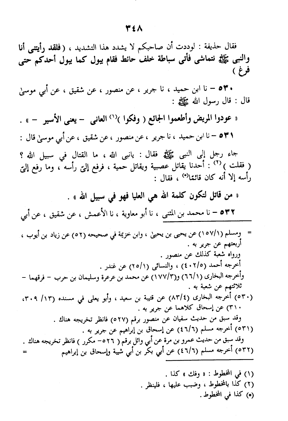 530 - نا ابْنُ حُمَيْدٍ، نا جَرِيرٌ، عَنْ مَنْصُورٍ، عَنْ شَقِيقٍ، عَنْ أَبِي مُوسَى قَالَ: قَالَ رَسُولُ اللَّهِ صَلَّى اللهُ عَلَيْهِ وَسَلَّمَ: «§عُودُوا الْمَرِيضَ وَأَطْعِمُوا الْجَائِعَ وَفُكُّوا الْعَانِيَ - يَعْنِي الْأَسِيرَ -»