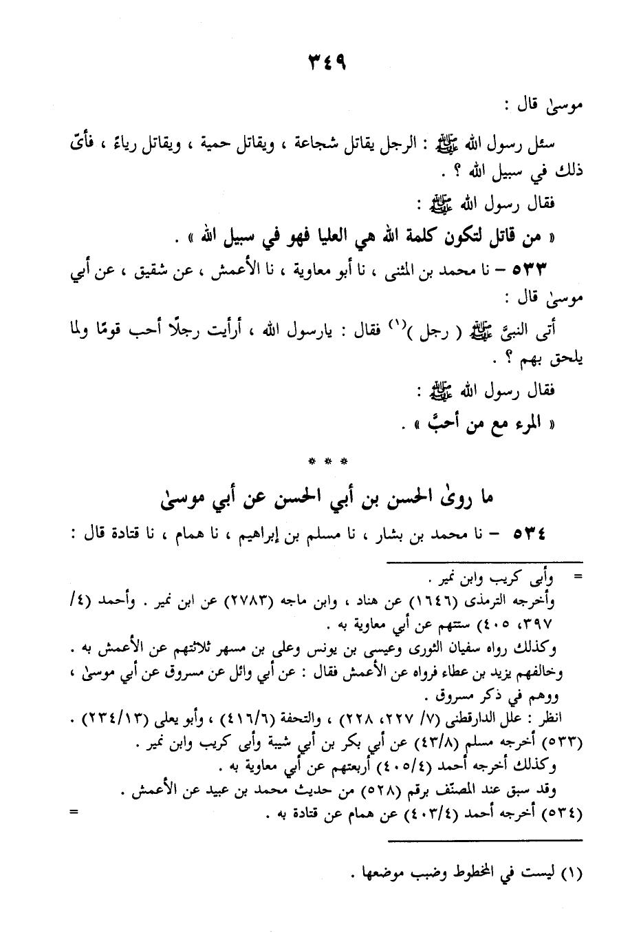 533 - نا مُحَمَّدُ بْنُ الْمُثَنَّى، نا أَبُو مُعَاوِيَةَ، نا الْأَعْمَشُ، عَنْ شَقِيقٍ، عَنْ أَبِي مُوسَى قَالَ: أَتَى النَّبِيَّ صَلَّى اللهُ عَلَيْهِ وَسَلَّمَ رَجُلٌ فَقَالَ: يَا رَسُولَ اللَّهِ، أَرَأَيْتَ رَجُلًا أَحَبَّ قَوْمًا وَلَمَّا يَلْحَقْ بِهِمْ؟ فَقَالَ رَسُولُ اللَّهِ صَلَّى اللهُ عَلَيْهِ وَسَلَّمَ: «§الْمَرْءُ مَعَ مَنْ أَحَبَّ»