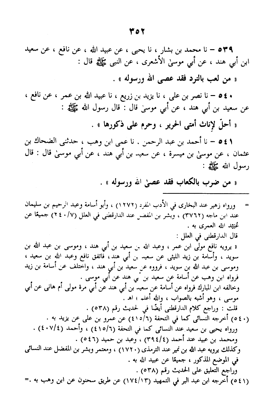 539 - نا مُحَمَّدُ بْنُ بَشَّارٍ، نا يَحْيَى، عَنْ عُبَيْدِ اللَّهِ، عَنْ نَافِعٍ، عَنْ سَعِيدِ بْنِ أَبِي هِنْدَ، عَنْ أَبِي مُوسَى الْأَشْعَرِيِّ، عَنِ النَّبِيِّ صَلَّى اللهُ عَلَيْهِ وَسَلَّمَ قَالَ: «§مَنْ لَعِبَ بِالنَّرْدِ فَقَدْ عَصَى اللَّهَ وَرَسُولَهُ»