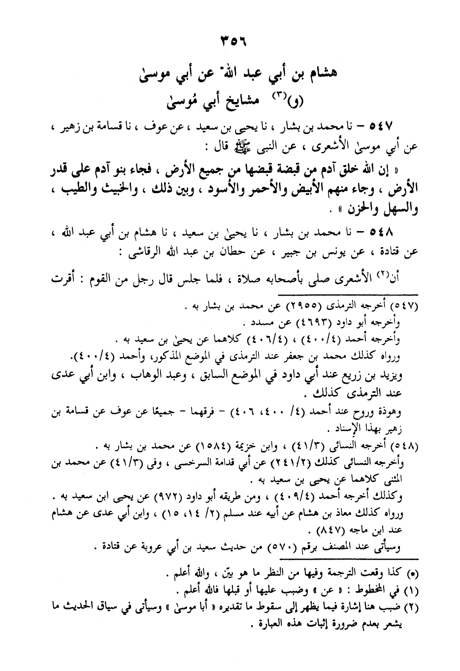547 - نا مُحَمَّدُ بْنُ بَشَّارٍ، نا يَحْيَى بْنُ سَعِيدٍ، عَنْ عَوْفٍ، نَا قَسَامَةُ بْنُ زُهَيْرٍ، عَنْ أَبِي مُوسَى الْأَشْعَرِيِّ، عَنِ النَّبِيِّ صَلَّى اللهُ عَلَيْهِ وَسَلَّمَ قَالَ: «§إنَّ اللَّهَ خَلَقَ آدَمَ مِنْ قَبْضَةٍ قَبَضَهَا مِنْ جَمِيعِ الْأَرْضِ، فَجَاءَ بَنُو آدَمَ عَلَى قَدْرِ الْأَرْضِ، وَجَاءَ مِنْهُمُ الْأَبْيَضُ وَالْأَحْمَرُ وَالْأَسْودُ وَبَيْنَ ذَلِكَ، وَالْخَبِيثُ وَالطِّيبُ، وَالسَّهْلُ وَالْحَزَنِ»