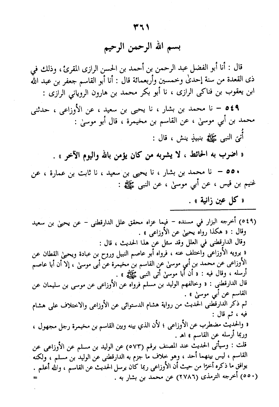 قال: أَنَا أَبُو الْفَضْلِ عَبْدُ الرَّحْمَنِ بْنُ أَحْمَدَ بْنِ الْحَسَنِ الرَّازِيُّ الْمُقْرِئُ وَذَلِكَ فِي ذِي الْقَعْدَةِ مِنْ سَنَةِ إِحْدَى وَخَمْسِينَ وَأَرْبَعِمِائَةٍ، قَالَ: أَنَا أَبُو الْقَاسِمِ جَعْفَرُ بْنُ عَبْدِ اللَّهِ بْنِ يَعْقُوبَ بْنِ فَنَاكِيّ الرَّازِيُّ، نَا أَبُو بَكْرٍ مُحَمَّدُ بْنُ هَارُونَ الرُّويَانِيُّ الرَّازِيُّ،