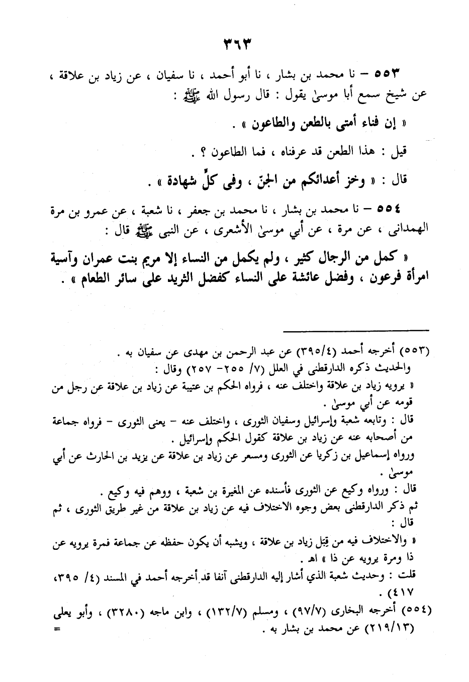 554 - نا مُحَمَّدُ بْنُ بَشَّارٍ، نا مُحَمَّدُ بْنُ جَعْفَرٍ، نا شُعْبَةُ، عَنْ عَمْرِو بْنِ مُرَّةَ الْهَمْدَانِيِّ، عَنْ مُرَّةَ، عَنْ أَبِي مُوسَى الْأَشْعَرِيِّ، عَنِ النَّبِيِّ صَلَّى اللهُ عَلَيْهِ وَسَلَّمَ قَالَ: «§كَمُلَ مِنَ الرِّجَالِ كَثِيرٌ، وَلَمْ يَكْمُلُ مِنَ النِّسَاءِ إِلَّا مَرْيَمُ بِنْتُ عِمْرَانَ وَآسِيَةُ امْرَأَةُ فِرْعَوْنَ، وَفَضْلُ عَائِشَةَ عَلَى النِّسَاءِ كَفَضْلِ الثَّرِيدِ عَلَى سَائِرِ الطَّعَامِ»