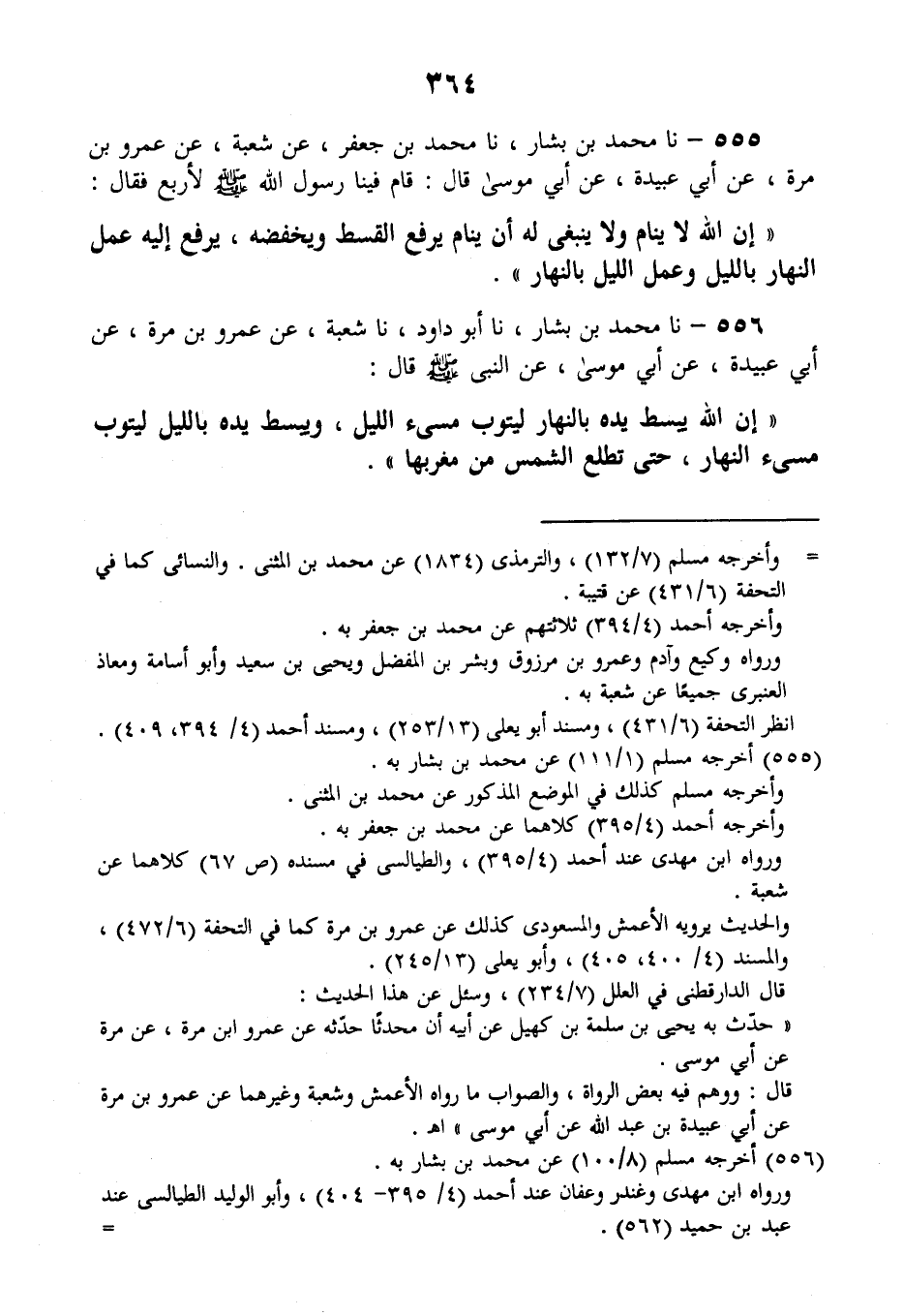 556 - نا مُحَمَّدُ بْنُ بَشَّارٍ، نا أَبُو دَاوُدَ، نا شُعْبَةُ، عَنْ عَمْرِو بْنِ مُرَّةَ، عَنْ أَبِي عُبَيْدَةَ، عَنْ أَبِي مُوسَى، عَنِ النَّبِيِّ صَلَّى اللهُ عَلَيْهِ وَسَلَّمَ قَالَ: «§إنَّ اللَّهَ يَبْسُطُ يَدَهُ بِالنَّهَارِ لِيَتُوبَ مُسِيءُ اللَّيْلِ، وَيَبْسُطُ يَدَهُ بِاللَّيْلِ لِيَتُوبَ مُسِيءُ النَّهَارِ حَتَّى تَطْلُعَ الشَّمْسُ مِنْ مَغْرِبِهَا»