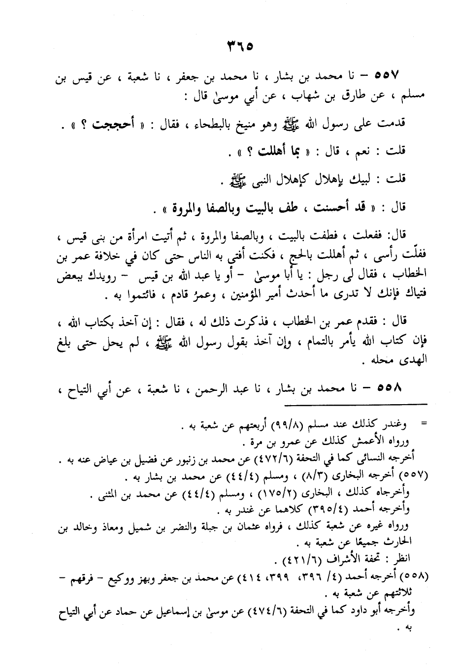 557 - نا مُحَمَّدُ بْنُ بَشَّارٍ، نا مُحَمَّدُ بْنُ جَعْفَرٍ، نا شُعْبَةُ، عَنْ قَيْسِ بْنِ مُسْلِمٍ، عَنْ طَارِقِ بْنِ شِهَابٍ، عَنْ أَبِي مُوسَى قَالَ: قَدِمْتُ عَلَى رَسُولِ اللَّهِ صَلَّى اللهُ عَلَيْهِ وَسَلَّمَ وَهُوَ مُنِيخٌ بِالْبَطْحَاءِ فَقَالَ: «أَحَجَجْتَ؟» قُلْتُ: نَعَمْ، قَالَ: «بِمَ أَهْلَلْتَ؟» قُلْتُ: §لَبَّيْكَ بِإِهْلَالٍ كَإِهْلَالِ النَّبِيِّ صَلَّى اللهُ عَلَيْهِ وَسَلَّمَ، قَالَ: «قَدْ أَحْسَنْتَ، طُفْ بِالْبَيْتِ وَبِالصَّفَا وَالْمَرْوَةِ» قَالَ: فَفَعَلْتُ، فَطُفْتُ بِالْبَيْتِ وَبِالصَّفَا وَالْمَرْوَةِ، ثُمَّ أَتَيْتُ امْرَأَةً مِنْ بَنِي قَيْسٍ فَفَلَّتْ رَأْسِي، ثُمَّ أَهْلَلْتُ بِالْحَجِّ، فَكُنْتُ أُفْتِي بِهِ النَّاسَ حَتَّى كَانَ فِي خِلَافَةِ عُمَرَ بْنِ الْخَطَّابِ فَقَالَ لِي رَجُلٌ: يَا أَبَا مُوسَى - أَوْ يَا عَبْدَ اللَّهِ بْنَ قَيْسٍ - رُوَيْدَكَ بِبَعْضِ فُتْيَاكَ، فَإِنَّكَ لَا تَدْرِي مَا أَحْدَثَ أَمِيرُ الْمُؤْمِنِينَ وَعُمَرُ قَادِمٌ فَائْتَمُّوا بِهِ، قَالَ: فَقَدِمَ عُمَرُ بْنُ الْخَطَّابِ فَذَكَرْتُ ذَلِكَ لَهُ فَقَالَ: إنْ آخُذُ بِكِتَابِ اللَّهِ، فَإِنَّ كِتَابَ اللَّهِ يَأْمُرُ بِالتَّمَامِ، وَإِنْ آخُذُ بِقَوْلِ رَسُولِ اللَّهِ صَلَّى اللهُ عَلَيْهِ وَسَلَّمَ، لَمْ يَحِلَّ حَتَّى بَلَغَ الْهَدْيُ مَحِلَّهُ "