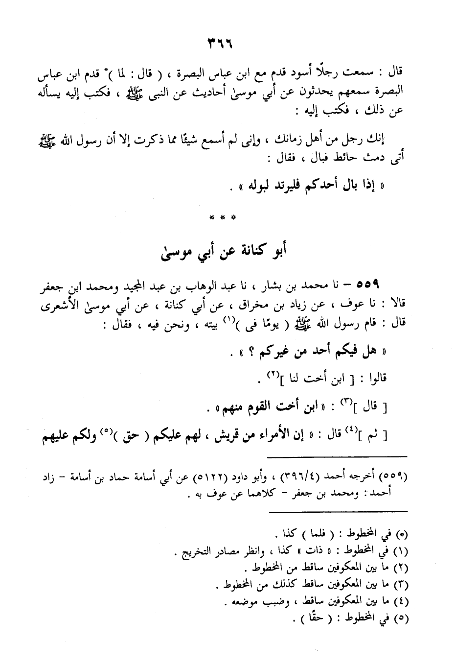 559 - نا مُحَمَّدُ بْنُ بَشَّارٍ، نا عَبْدُ الْوَهَّابِ بن عَبْدُ الْمَجِيدِ، وَمُحَمَّدُ بْنُ جَعْفَرٍ قَالَا: نا عَوْفٌ، عَنْ زِيَادِ بْنِ مِخْرَاقٍ، عَنْ أَبِي كِنَانَةَ، عَنْ أَبِي مُوسَى الْأَشْعَرِيِّ قَالَ: قَامَ رَسُولُ اللَّهِ صَلَّى اللهُ عَلَيْهِ وَسَلَّمَ يَوْمًا فِي بَيْتِهِ وَنَحْنُ فِيهِ فَقَالَ: «هَلْ فِيكُمْ أَحَدٌ مِنْ غَيْرِكُمْ؟» قَالُوا: ابْنُ أُخْتٍ لَنَا، قَالَ: «ابْنُ أُخْتِ الْقَوْمِ مِنْهُمْ» ثُمَّ قَالَ: «إنَّ §الْأُمَرَاءَ مِنْ قُرَيْشٍ لَهُمْ عَلَيْكُمْ حَقٌّ وَلَكُمْ عَلَيْهِمْ -[367]- مِثْلُ ذَلِكَ، فَإِنِ اسْتُرْحِمُوا رَحِمُوا، وَإِنْ حُكِّمُوا عَدَلُوا، وَمَنْ لَمْ يَفْعَلْ ذَلِكَ فَعَلَيْهِ لَعْنَةُ اللَّهِ وَالْمَلَائِكَةِ وَالنَّاسِ أَجْمَعِينَ، لَا يُقْبَلُ مِنْهُ صِرْفٌ وَلَا عَدْلٌ»