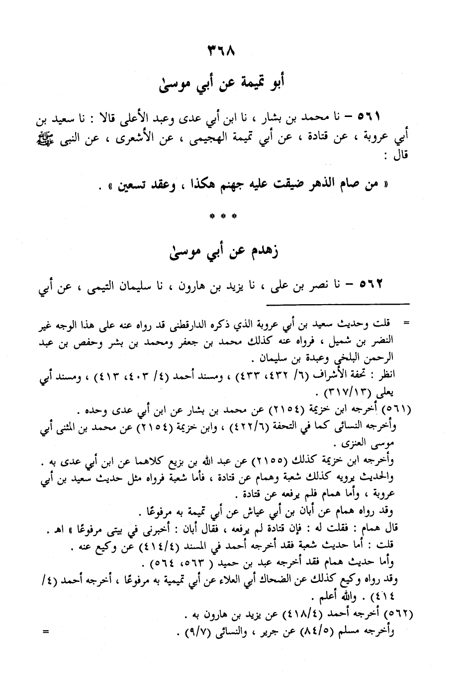 561 - نا مُحَمَّدُ بْنُ بَشَّارٍ، نا ابْنُ أَبِي عَدِيٍّ وَعَبْدُ الْأَعْلَى قَالَا: نا سَعِيدُ بْنُ أَبِي عَرُوبَةَ، عَنْ قَتَادَةَ، عَنْ أَبِي تَمِيمَةَ الْهُجَيْمِيِّ، عَنِ الْأَشْعَرِيِّ، عَنِ النَّبِيِّ صَلَّى اللهُ عَلَيْهِ وَسَلَّمَ قَالَ: «§مَنْ صَامَ الدَّهْرَ ضُيِّقَتْ عَلَيْهِ جَهَنَّمُ هَكَذَا، وَعَقَدَ تِسْعِينَ»