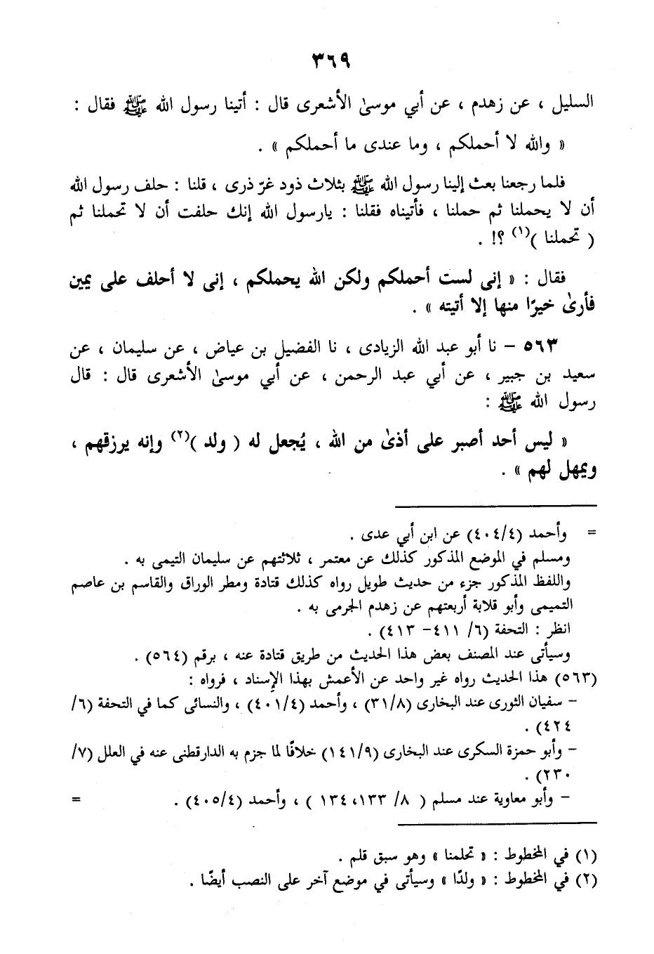 563 - نا أَبُو عَبْدِ اللَّهِ الزِّيَادِيُّ، نا الْفُضَيْلُ بْنُ عِيَاضٍ، عَنْ سُلَيْمَانَ، عَنْ سَعِيدِ بْنِ جُبَيْرٍ، عَنْ أَبِي عَبْدِ الرَّحْمَنِ، عَنْ أَبِي مُوسَى الْأَشْعَرِيِّ قَالَ: قَالَ رَسُولُ اللَّهِ صَلَّى اللهُ عَلَيْهِ وَسَلَّمَ: «§لَيْسَ أَحَدٌ أَصْبَرَ عَلَى أَذًى مِنَ اللَّهِ، يُجْعَلُ لَهُ وَلَدٌ، وَإِنَّهُ يَرْزُقُهُمْ وَيُمْهِلُ لَهُمْ»
