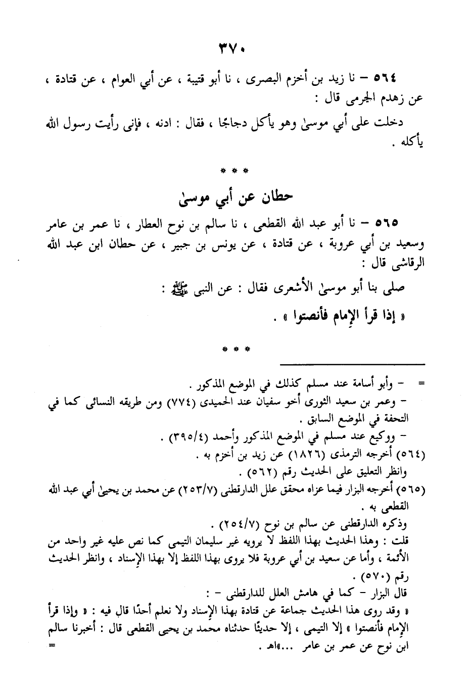 565 - نا أَبُو عَبْدِ اللَّهِ الْقُطَعِيُّ، نا سَالِمُ بْنُ نُوحٍ الْعَطَّارُ، نا عُمَرُ بْنُ عَامِرِ وَسَعِيدُ بْنُ أَبِي عَرُوبَةَ، عَنْ قَتَادَةَ، عَنْ يُونُسَ بْنِ جُبَيْرٍ، عَنْ حِطَّانَ بْنِ عَبْدِ اللَّهِ الرَّقَاشِيِّ قَالَ: صَلَّى بِنَا أَبُو مُوسَى الْأَشْعَرِيُّ فَقَالَ: عَنِ النَّبِيِّ صَلَّى اللهُ عَلَيْهِ وَسَلَّمَ: «§إِذَا قَرَأَ الْإِمَامُ فَأَنْصِتُوا»