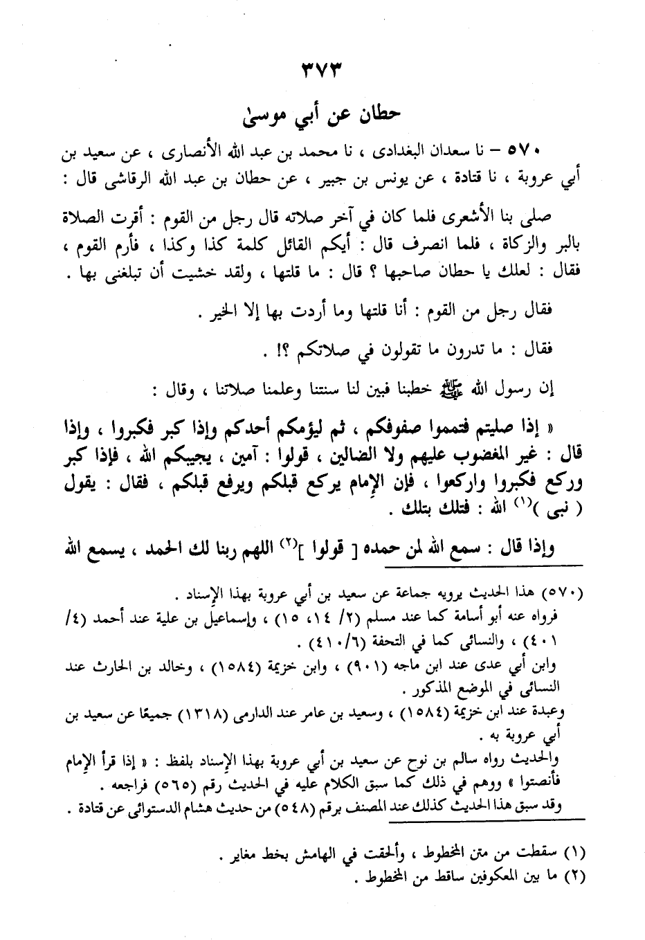 570 - نا سَعْدَانُ الْبَغْدَادِيُّ، نا مُحَمَّدُ بْنُ عَبْدِ اللَّهِ الْأَنْصَارِيُّ، عَنْ سَعِيدِ بْنِ أَبِي عَرُوبَةَ، نَا قَتَادَةُ، عَنْ يُونُسَ بْنِ جُبَيْرٍ، عَنْ حِطَّانَ بْنِ عَبْدِ اللَّهِ الرَّقَاشِيِّ قَالَ: صَلَّى بِنَا الْأَشْعَرِيُّ، فَلَمَّا كَانَ فِي آخِرِ صَلَاتِهِ قَالَ رَجُلٌ مِنَ الْقَوْمِ: أَقَرَّتِ الصَّلَاةُ بِالْبِرِّ، وَالزَّكَاةُ، فَلَمَّا انْصَرَفَ قَالَ: أَيُّكُمُ الْقَائِلُ كَلِمَةَ كَذَا وَكَذَا؟ فَأَرَمَّ الْقَوْمُ، فَقَالَ: لَعَلَّكَ يَا حِطَّانُ صَاحِبُهَا؟ قَالَ: مَا قُلْتُهَا، وَلَقَدْ خَشِيتُ أَنَّ تَبْلُغَنِي بِهَا، فَقَالَ رَجُلٌ مِنَ الْقَوْمِ: أَنَا قُلْتُهَا وَمَا أَرَدْتُ بِهَا إِلَّا الْخَيْرَ، فَقَالَ: مَا تَدْرُونَ مَا تَقُولُونَ فِي صَلَاتِكُمْ؟ إنَّ رَسُولَ اللَّهِ صَلَّى اللهُ عَلَيْهِ وَسَلَّمَ خَطَبَنَا فَبَيَّنَ لَنَا سُنَّتَنَا، وَعَلَّمَنَا صَلَاتَنَا، وَقَالَ: " §إِذَا صَلَّيْتُمْ فَتَمِّمُوا صُفُوفَكُمْ، ثُمَّ لِيَؤُمَّكُمْ أَحَدُكُمْ، وَإِذَا كَبَّرَ فَكَبِّرُوا، وَإِذَا قَالَ: {غَيْرِ الْمَغْضُوبِ عَلَيْهِمْ وَلَا الضَّالِّينَ} [الفاتحة: 7] قُولُوا: آمِينَ، يُجِيبُكُمُ اللَّهُ، فَإِذَا كَبَّرَ وَرَكَعَ فَكَبِّرُوا وَارْكَعُوا، فَإِنَّ الْإِمَامَ يَرْكَعُ قَبْلَكُمْ وَيَرْفَعُ قَبْلَكُمْ، فَقَالَ: يَقُولُ نَبِيُّ اللَّهِ: فَتِلْكَ بِتِلْكَ، وَإِذَا قَالَ: سَمِعَ اللَّهُ لِمَنْ حَمِدَهُ، قُولُوا: اللَّهُمَّ رَبَّنَا لَكَ الْحَمْدُ، يَسْمَعُ اللَّهُ -[374]- لَكُمْ، فَإِنَّ اللَّهَ قَالَ عَلَى لِسَانِ نَبِيِّهِ: سَمِعَ اللَّهُ لِمَنْ حَمِدَهُ، فَإِذَا كَبَّرَ وَسَجَدَ فَكَبِّرُوا وَاسْجُدُوا، فَإِنَّ الْإِمَامَ يَسْجُدُ قَبْلَكُمْ وَيَرْفَعُ قَبْلَكُمْ، فَقَالَ نَبِيُّ اللَّهِ عَلَيْهِ السَّلَامُ: فَتِلْكَ بِتِلْكَ، فَإِذَا كَانَ بَعْدَ الْقُعُودِ فَلْيَكُنْ قَوْلُ أَحَدِكُمُ: التَّحِيَّاتُ الطَّيِّبَاتُ لِلَّهِ، الصَّلَوَاتُ، السَّلَامُ عَلَيْكَ أَيُّهَا النَّبِيُّ وَرَحْمَةُ اللَّهِ، السَّلَامُ عَلَيْنَا وَعَلَى عِبَادِ اللَّهِ الصَّالِحِينَ، أَشْهَدُ أَنْ لَا إِلَهَ إِلَّا اللَّهُ، وَأَنَّ مُحَمَّدًا عَبْدُهُ وَرَسُولُهُ " قَالَ قَتَادَةُ: سَبْعُ كَلِمَاتٍ هِيَ تَحِيَّةُ الصَّلَاةِ