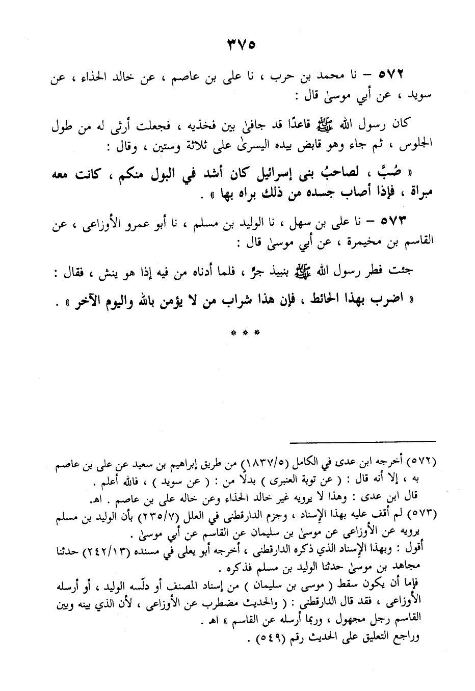 572 - نا مُحَمَّدُ بْنُ حَرْبٍ، نا عَلِيُّ بْنُ عَاصِمٍ، عَنْ خَالِدٍ الْحَذَّاءِ، عَنْ سُوَيْدٍ، عَنْ أَبِي مُوسَى قَالَ: كَانَ رَسُولُ اللَّهِ صَلَّى اللهُ عَلَيْهِ وَسَلَّمَ قَاعِدًا، قَدْ جَافَى بَيْنَ فَخْذَيْهِ، فَجَعَلْتُ أَرْثِي لَهُ مِنْ طُولِ الْجُلُوسِ، ثُمَّ جَاءَ وَهُوَ قَابِضٌ بِيَدِهِ الْيُسْرَى عَلَى ثَلَاثَةٍ وَسِتِّينَ وَقَالَ: «§صُبَّ، لَصَاحِبُ بَنِي إِسْرَائِيلَ كَانَ أَشَدَّ فِي الْبَوْلِ مِنْكُمْ، كَانَتْ مَعَهُ مِبْرَاةٌ، فَإِذَا أَصَابَ جَسَدُهُ مِنْ ذَلِكَ بَرَاهُ بِهَا»