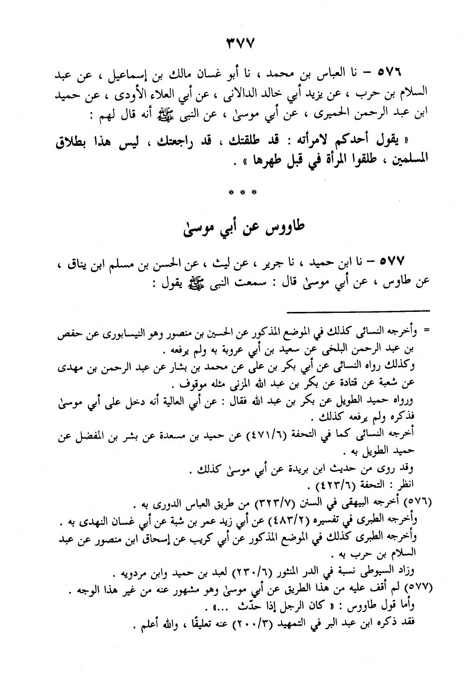 576 - نا الْعَبَّاسُ بْنُ مُحَمَّدٍ، نا أَبُو غَسَّانَ مَالِكُ بْنُ إِسْمَاعِيلَ، عَنْ عَبْدِ السَّلَامِ بْنِ حَرْبٍ، عَنْ يَزِيدَ بْنِ أَبِي خَالِدٍ الدَّالَانِيِّ، عَنْ أَبِي الْعَلَاءِ الْأَوْدِي، عَنْ حُمَيْدِ بْنِ عَبْدِ الرَّحْمَنِ الْحِمْيَرِيِّ، عَنْ أَبِي مُوسَى، عَنِ النَّبِيِّ صَلَّى اللهُ عَلَيْهِ وَسَلَّمَ أَنَّهُ قَالَ لَهُمْ: " §يَقُولُ أَحَدُكُمْ لِامْرَأَتِهِ: قَدْ طَلَّقْتُكِ، قَدْ رَاجَعْتُكِ، لَيْسَ هَذَا بِطَلَاقِ الْمُسْلِمِينَ، طَلِّقُوا الْمَرْأَةَ فِي قِبَلِ طُهْرِهَا "