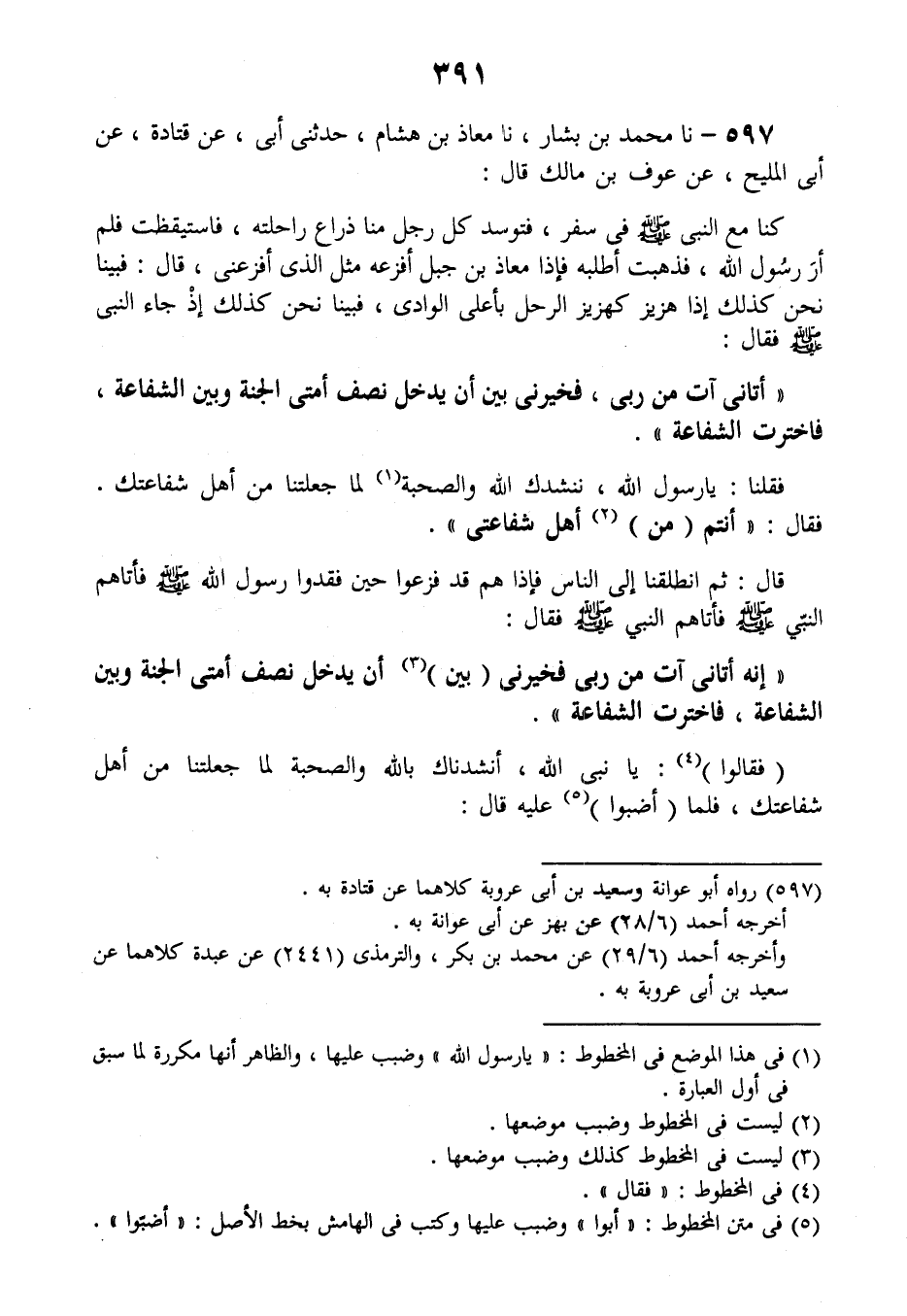 597 - نا مُحَمَّدُ بْنُ بَشَّارٍ، نا مُعَاذُ بْنُ هِشَامٍ، حَدَّثَنِي أَبِي، عَنْ قَتَادَةَ، عَنْ أَبِي الْمَلِيحِ، عَنْ عَوْفِ بْنِ مَالِكٍ قَالَ: كُنَّا مَعَ النَّبِيِّ صَلَّى اللهُ عَلَيْهِ وَسَلَّمَ فِي سَفَرٍ، فَتَوَسَّدَ كُلُّ رَجُلٍ مِنَّا ذِرَاعَ رَاحِلَتِهِ، فَاسْتَيْقَظْتُ فَلَمْ أَرَ رَسُولَ اللَّهِ صَلَّى اللهُ عَلَيْهِ وَسَلَّمَ، فَذَهَبْتُ أَطْلُبُهُ، فَإِذَا مُعَاذُ بْنُ جَبَلٍ أَفْزَعَهُ مِثْلُ الَّذِي أَفْزَعَنِي، قَالَ: فَبَيْنَا نَحْنُ كَذَلِكَ، إِذَا هَزِيزٌ كَهَزِيزِ الرَّحْلِ بِأَعْلَى الْوَادِي، فَبَيْنَا نَحْنُ كَذَلِكَ إِذْ جَاءَ النَّبِيُّ صَلَّى اللهُ عَلَيْهِ وَسَلَّمَ فَقَالَ: «أَتَانِي آتٍ مِنْ رَبِّي، §فَخَيَّرَنِي بَيْنَ أَنْ يَدْخُلَ نِصْفُ أَمَّتِي الْجَنَّةَ وَبَيْنَ الشَّفَاعَةِ، فَاخْتَرْتُ الشَّفَاعَةَ» فَقُلْنَا: يَا رَسُولَ اللَّهِ، نَنْشُدُكَ اللَّهَ وَالصُّحْبَةَ، لَمَّا جَعَلْتَنَا مِنْ أَهْلِ شَفَاعَتِكَ، فَقَالَ: «أَنْتُمْ مِنْ أَهْلِ شَفَاعَتِي» ، قَالَ: ثُمَّ انْطَلَقْنَا إِلَى النَّاسِ، فَإِذَا هُمْ قَدْ فَزِعُوا حِينَ فَقَدُوا رَسُولَ اللَّهِ صَلَّى اللهُ عَلَيْهِ وَسَلَّمَ، فَأَتَاهُمُ النَّبِيُّ صَلَّى اللهُ عَلَيْهِ وَسَلَّمَ فَقَالَ: «إِنَّهُ أَتَانِي آتٍ مِنْ رَبِّي، فَخَيَّرَنِي بَيْنَ أَنْ يَدْخُلَ نِصْفُ أُمَّتِي الْجَنَّةَ وَبَيْنَ الشَّفَاعَةِ، فَاخْتَرْتُ الشَّفَاعَةَ» فَقَالُوا: يَا نَبِيَّ اللَّهِ أَنْشَدْنَاكَ بِاللَّهِ وَالصُّحْبَةِ لَمَّا جَعَلْتَنَا مِنْ أَهْلِ شَفَاعَتِكَ، فَلَمَّا أَضَبُّوا عَلَيْهِ قَالَ -[392]-: «شَفَاعَتِي لِمَنْ مَاتَ مِنْ أُمَّتِي لَا يُشْرِكُ بِاللَّهِ شَيْئًا»