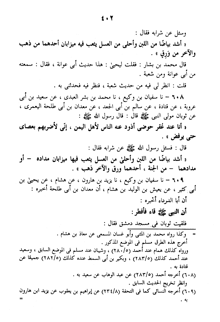 608 - نا سُفْيَانُ بْنُ وَكِيعٍ، نا مُحَمَّدُ بْنُ بِشْرٍ الْعَبْدِيُّ، عَنْ سَعِيدِ بْنِ أَبِي عَرُوبَةَ، عَنْ قَتَادَةَ، عَنْ سَالِمِ بْنِ أَبِي الْجَعْدِ، عَنْ مَعْدَانَ بْنِ أَبِي طَلْحَةَ الْيَعْمَرِيِّ، عَنْ ثَوْبَانَ مَوْلَى النَّبِيِّ صَلَّى اللهُ عَلَيْهِ وَسَلَّمَ قَالَ: قَالَ رَسُولُ اللَّهِ صَلَّى اللهُ عَلَيْهِ وَسَلَّمَ: «§أَنَا عِنْدَ عُقِرِ حَوْضِي أَذُودُ عَنْهُ النَّاسَ لِأَهْلِ الْيَمَنِ، إِنِّي لَأَضْرِبُهُمْ بِعَصَايَ حَتَّى يَرْفَضَّ» قَالَ: فَسُئِلَ رَسُولُ اللَّهِ صَلَّى اللهُ عَلَيْهِ وَسَلَّمَ عَنْ شَرَابِهِ فَقَالَ: «أَشَدُّ بَيَاضًا مِنَ اللَّبَنِ، وَأَحْلَى مِنَ الْعَسَلِ، يَثْعَبُ فِيهَا مِيزَابَانِ، مِدَادُهُ أَوْ مِدَادُهُمَا مِنَ الْجَنَّةِ، أَحَدُهُمَا وَرِقٌ، وَالْآخَرُ ذَهَبٌ»