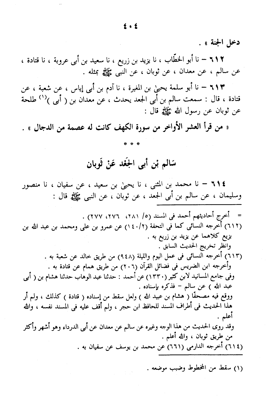 613 - نا أَبُو سَلَمَةَ يَحْيَى بْنُ الْمُغِيرَةِ، نا آدَمُ بْنُ أَبِي إِيَاسٍ، عَنْ شُعْبَةَ، عَنْ قَتَادَةَ قَالَ: سَمِعْتُ سَالِمَ بْنَ أَبِي الْجَعْدِ يُحَدِّثُ، عَنْ مَعْدَانَ بْنِ أَبِي طَلْحَةَ، عَنْ ثَوْبَانَ، عَنْ رَسُولِ اللَّهِ صَلَّى اللهُ عَلَيْهِ وَسَلَّمَ قَالَ: «§مَنْ قَرَأَ الْعَشْرَ الْأَوَاخِرَ مِنْ سُورَةِ الْكَهْفِ كَانَتْ لَهُ عِصْمَةً مِنَ الدَّجَّالِ»