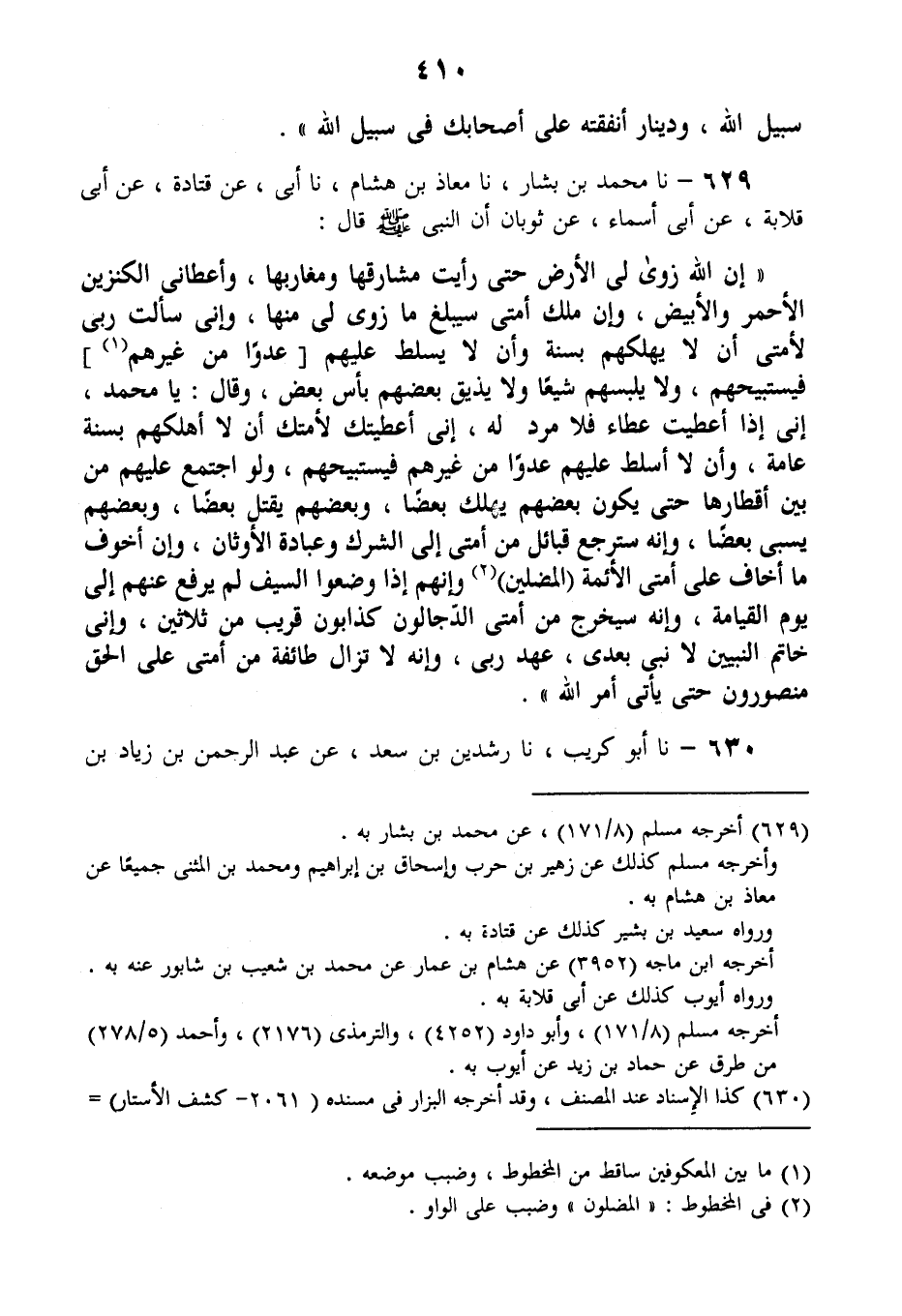 629 - نا مُحَمَّدُ بْنُ بَشَّارٍ، نا مُعَاذُ بْنُ هِشَامٍ، نا أَبِي، عَنْ قَتَادَةَ، عَنْ أَبِي قِلَابَةَ، عَنْ أَبِي أَسْمَاءَ، عَنْ ثَوْبَانَ، أَنَّ النَّبِيَّ صَلَّى اللهُ عَلَيْهِ وَسَلَّمَ قَالَ: " §إنَّ اللَّهَ زَوَى لِيَ الْأَرْضَ حَتَّى رَأَيْتُ مَشَارِقَهَا وَمَغَارِبَهَا، وَأعْطَانِي الْكَنْزَيْنِ: الْأَحْمَرَ وَالْأَبْيَضَ، وَإِنَّ مُلْكُ أُمَّتِي سَيَبْلُغُ مَا زَوَى لِي مِنْهَا، وَإِنِّي سَأَلْتُ رَبِّي لِأُمَّتِي أَنْ لَا يُهْلِكَهُمْ بِسَنَةٍ، وَأَنْ لَا يُسَلِّطَ عَلَيْهِمْ عَدُوًّا مِنْ غَيْرِهِمْ فَيَسْتَبِيحَهُمْ، وَلَا يَلْبِسَهُمْ شِيَعًا، وَلَا يُذِيقَ بَعْضَهُمْ بَأْسَ بَعْضٍ، وَقَالَ: يَا مُحَمَّدُ، إِنِّي إِذَا أَعْطَيْتُ عَطَاءً فَلَا مَرَدَّ لَهُ، إِنِّي أَعْطَيْتُكَ لِأُمَّتِكَ: أَنْ لَا أَهْلَكَهُمْ بِسَنَةٍ عَامَّةٍ، وَأَنْ لَا أُسَلِّطَ عَلَيْهِمْ عَدُوًّا مِنْ غَيْرِهِمْ فَيَسْتَبِيحَهُمْ وَلَوِ اجْتَمَعَ عَلَيْهِمْ مَنْ بَيْنَ أَقْطَارِهَا حَتَّى يَكُونَ بَعْضُهُمْ يُهْلِكُ بَعْضًا، وَبَعْضُهُمْ يَقْتُلُ بَعْضًا، وَبَعْضُهُمْ يَسْبِي بَعْضًا، وَإِنَّهُ سَتَرْجِعُ قَبَائِلُ مِنْ أُمَّتِي إِلَى الشِّرْكِ وَعِبَادَةِ الْأَوْثَانِ، وَإِنَّ أَخْوَفُ مَا أَخَافُ عَلَى أُمَّتِي الْأَئِمَّةَ الْمُضِلِّينَ، وَإِنَّهُمْ إِذَا وَضَعُوا السَّيْفَ لَمْ يُرْفَعْ عَنْهُمْ إِلَى يَوْمِ الْقِيَامَةِ، وَإِنَّهُ سَيَخْرُجُ مِنْ أُمَّتِي الدَّجَّالُونَ كَذَّابُونَ قَرِيبٌ مِنْ ثَلَاثِينَ، وَإِنِّي خَاتَمُ النَّبِيِّينَ لَا نَبِيَّ بَعْدِي، عَهْدُ رَبِّي، وَإِنَّهُ لَا تَزَالُ طَائِفَةٌ مِنْ أُمَّتِي عَلَى الْحَقِّ مَنْصُورُونَ حَتَّى يَأْتِيَ أَمْرُ اللَّهِ "